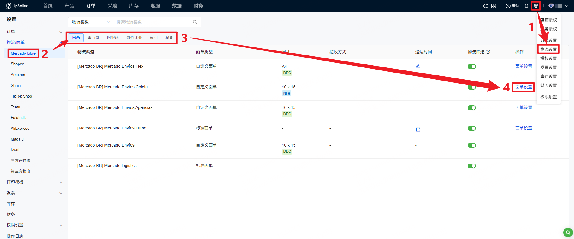 1. 点击 设置 >> 物流设置,选择平台和物流进行面单设置