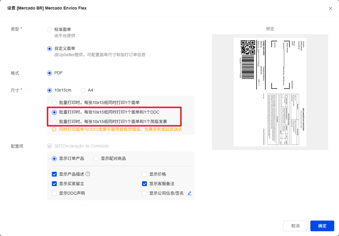 UpSeller支持设置自定义面单,实现在 10x15 热敏纸上同时打印面单和发票,或者面单和DDC,在节省成本的同时实现高效打印二、注意事项