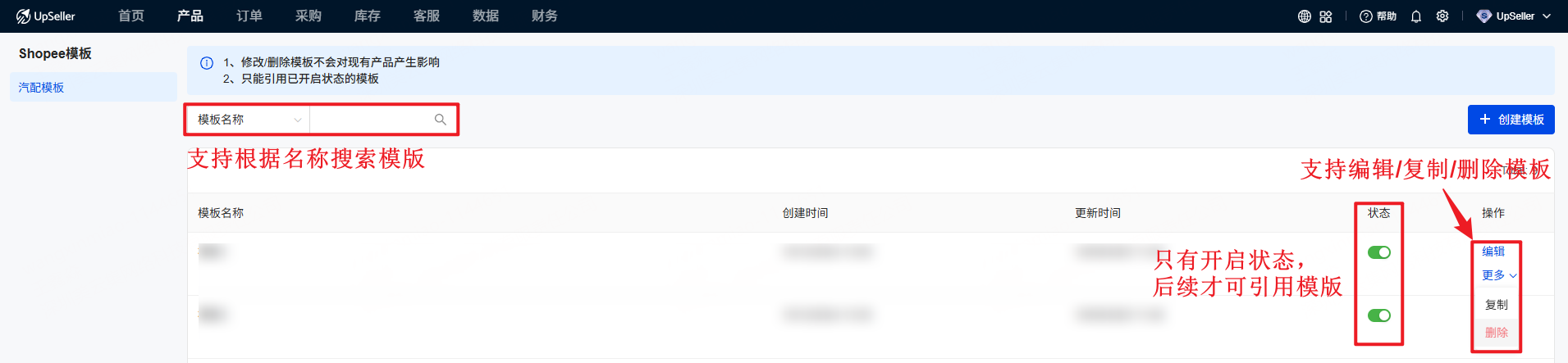 3.创建成功后,模版将展示在列表页。支持编辑/复制/删除模版信息