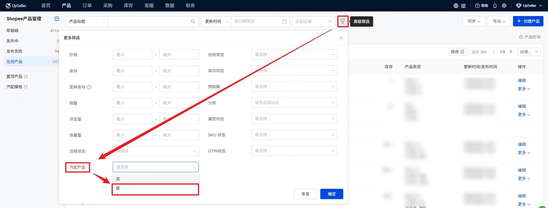 1.进入Shopee草稿箱/在线产品页面>>点击“高级筛选”>>汽配产品“是”,筛选出汽配产品
