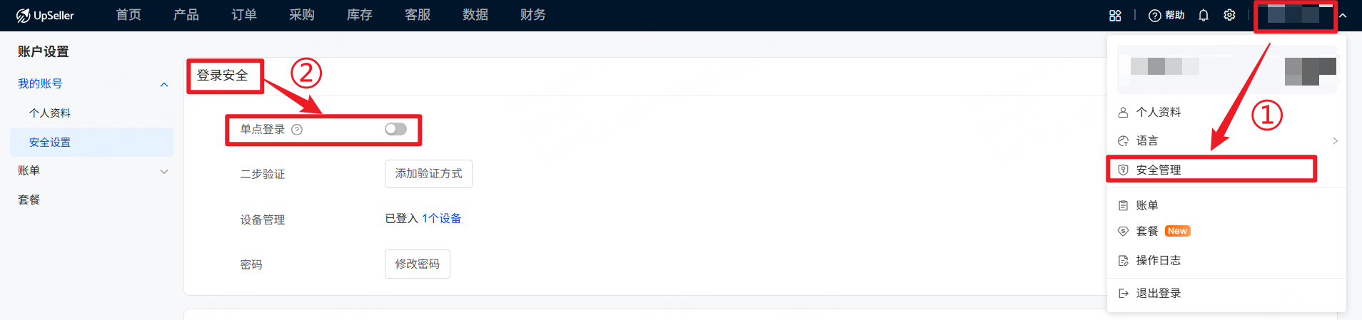 一、定义 UpSeller支持为账号设置单点登录,即一个UpSeller账号,同一时间仅支持一个IP地址以及一个设备登录,切换设备和IP登录需要验证邮箱,且除本IP地址设备外的其他账号会退出登陆 二、注意事项 同一台电脑的不同的浏览器会被识别为不同的设备 三、启用的操作步骤 1.点击右上角个人账号>>安全管理>>登录安全>>打开“单点登录”开关 2.点击“激活” 四、关闭的操作步骤 点击关闭>>发送验证码并填写>>点击“处理”