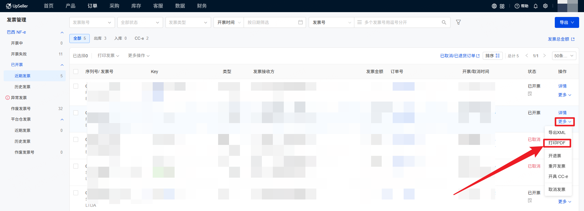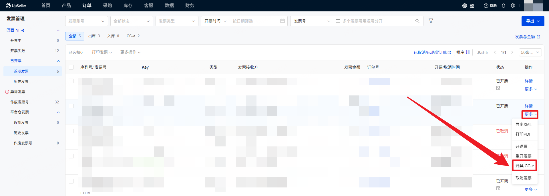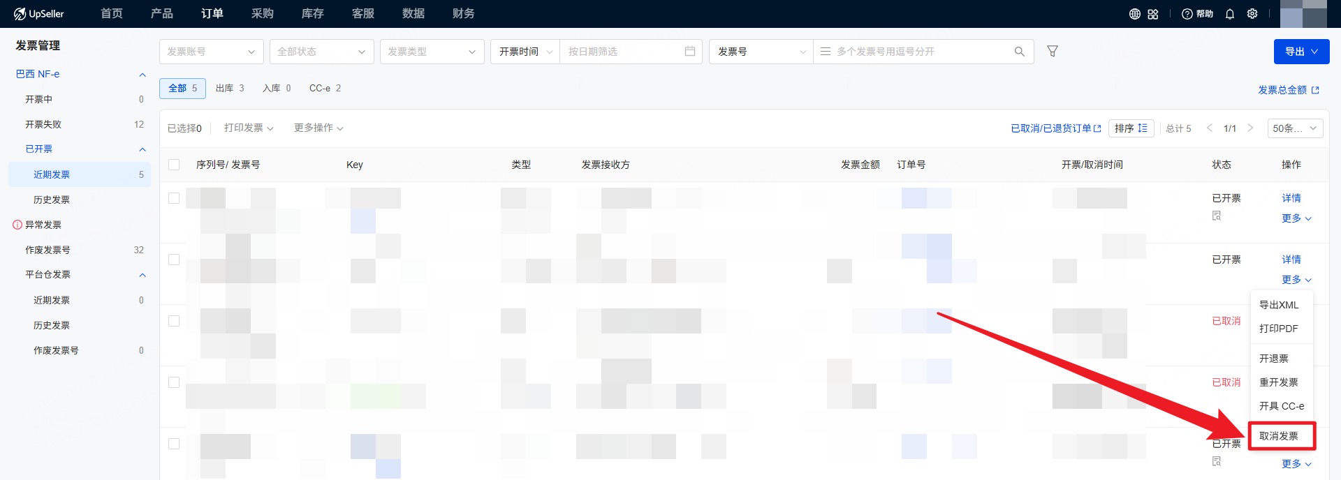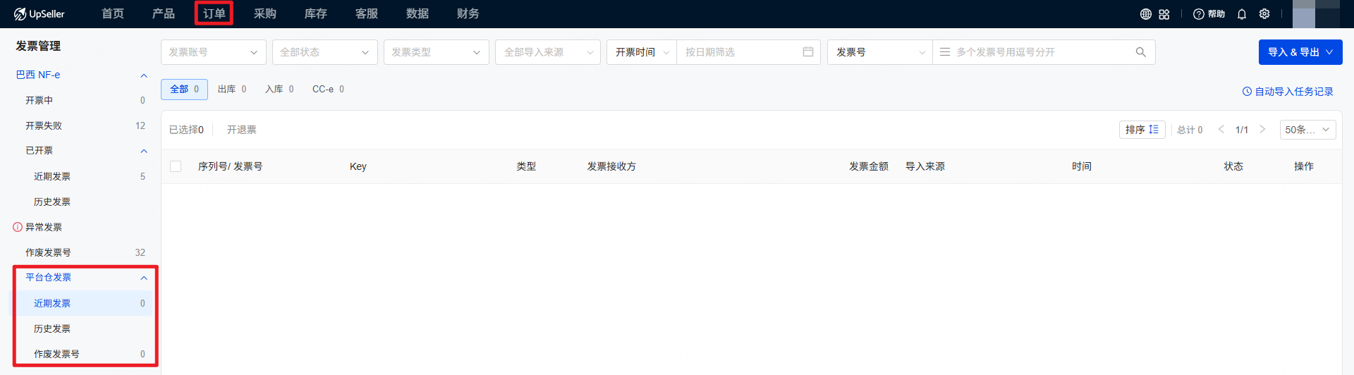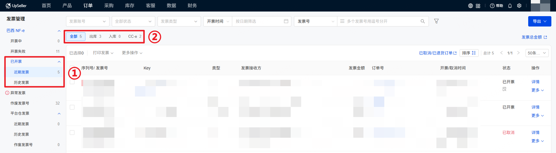 针对巴西卖家发票管理的实际需求,UpSeller发票管理功能囊括功能全面,包括查看近期发票、历史发票和平台仓发票,处理异常发票(取消发票/开退票),发票导出,重开发票,开CC-e修改发票以及作废发票号的功能。二、操作步骤