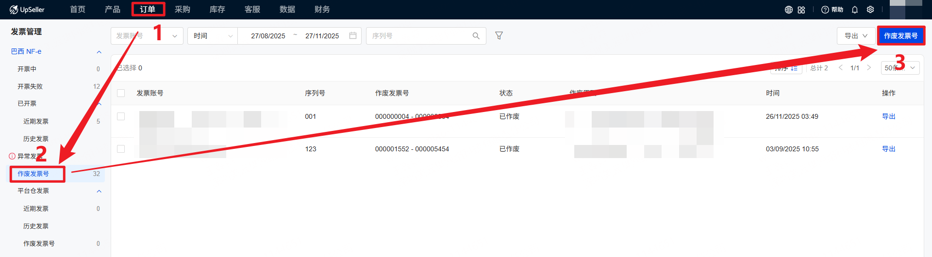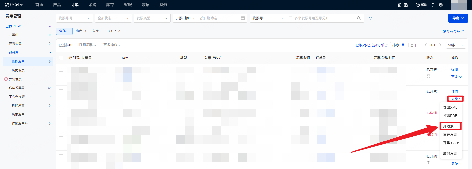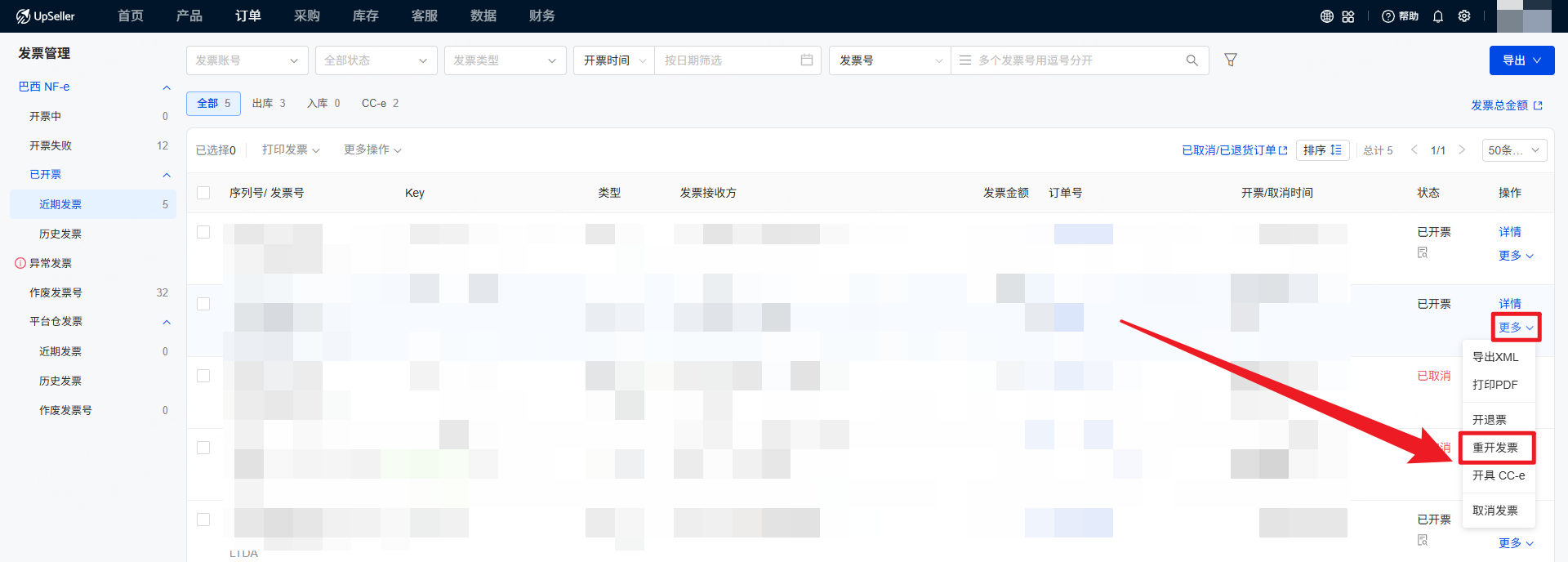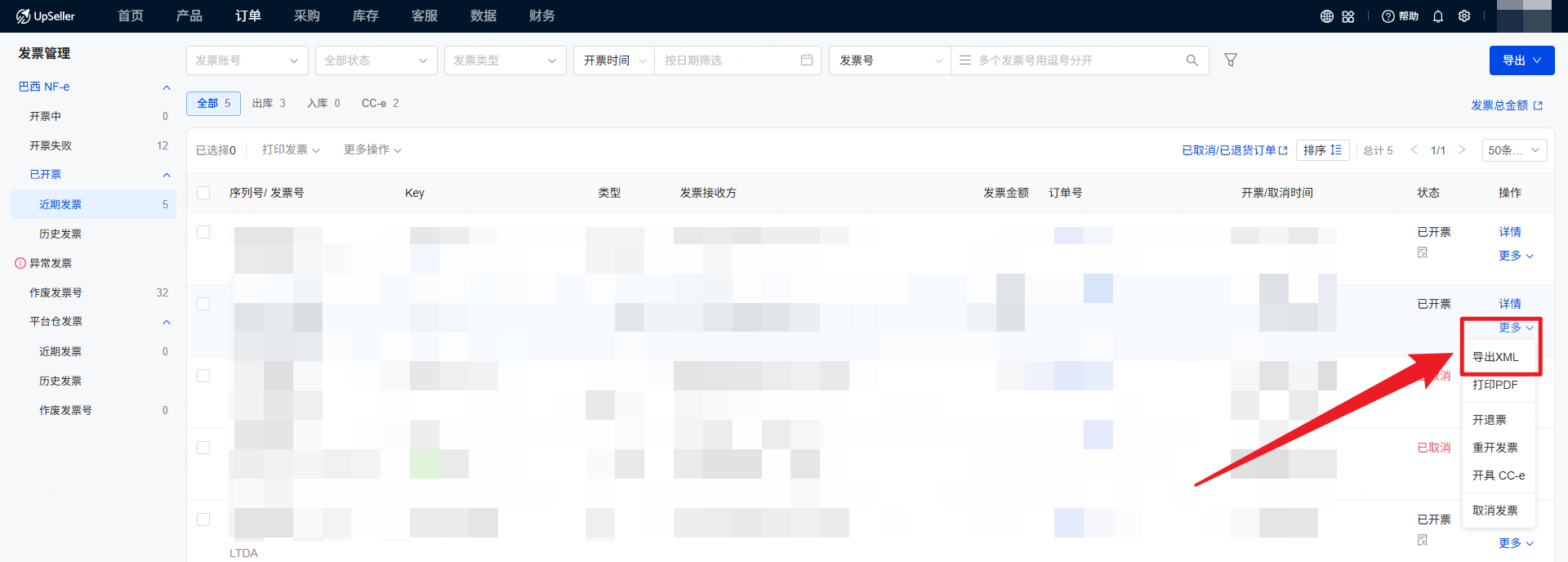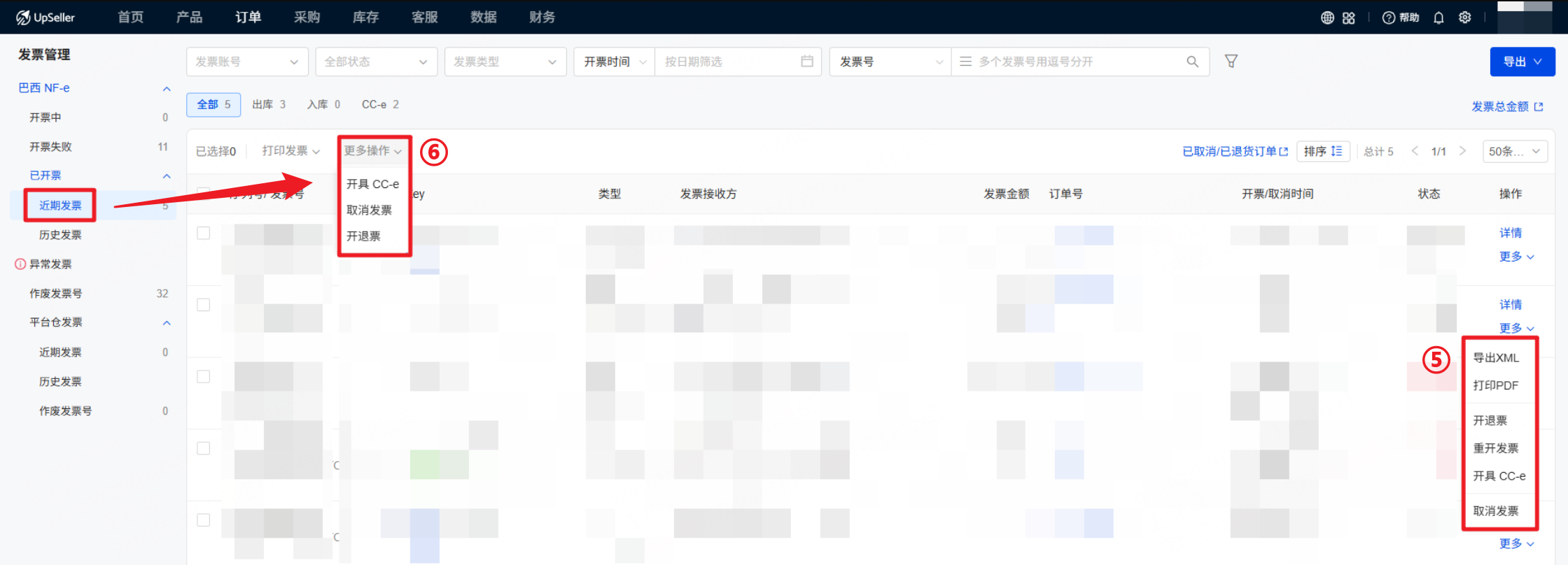 针对巴西卖家发票管理的实际需求,UpSeller发票管理功能囊括功能全面,包括查看近期发票、历史发票和平台仓发票,处理异常发票(取消发票/开退票),发票导出,重开发票,开CC-e修改发票以及作废发票号的功能。二、操作步骤
