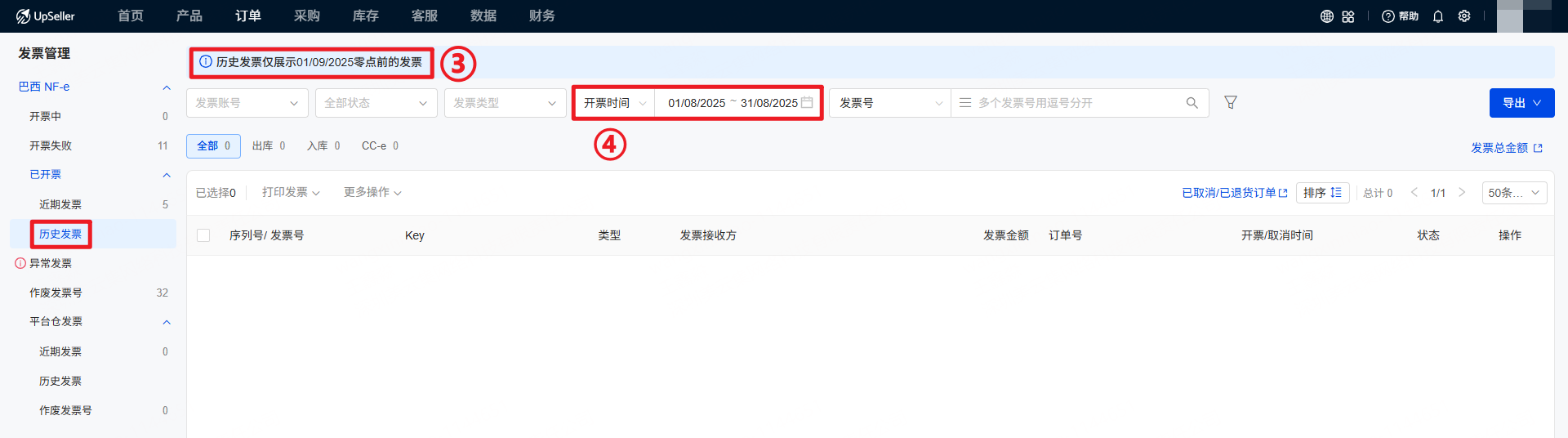 ① 点击订单 >> 巴西NF-e,默认进入【近期发票】页面;在发票数据中只展示【近期发票】的总数,不展示【历史发票】总数