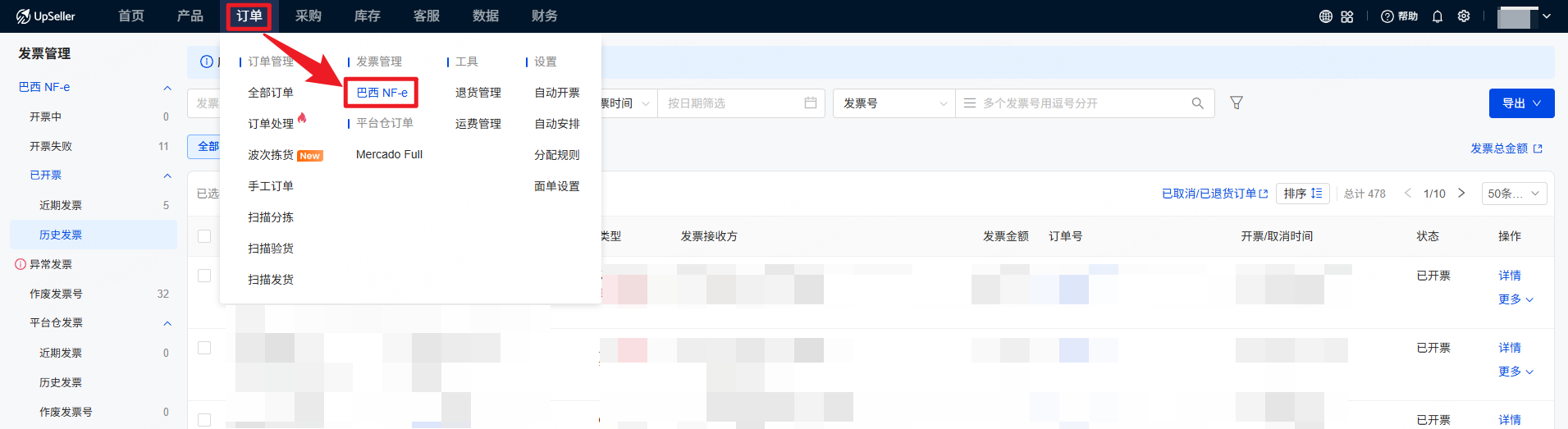 点击订单 >> 巴西NF-e,进入巴西发票管理界面