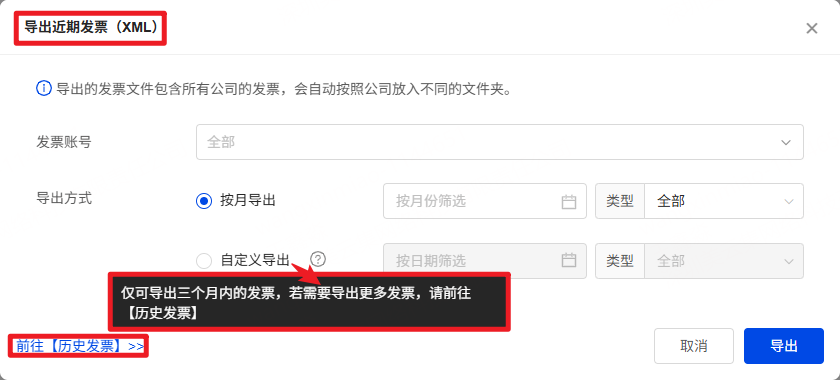 ②【历史发票】只能导出三个月前的发票