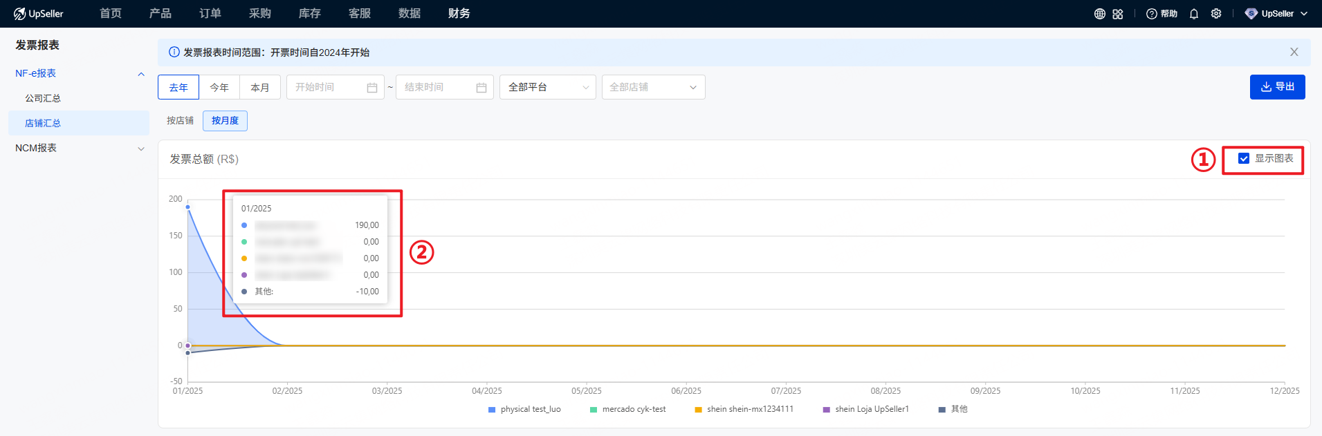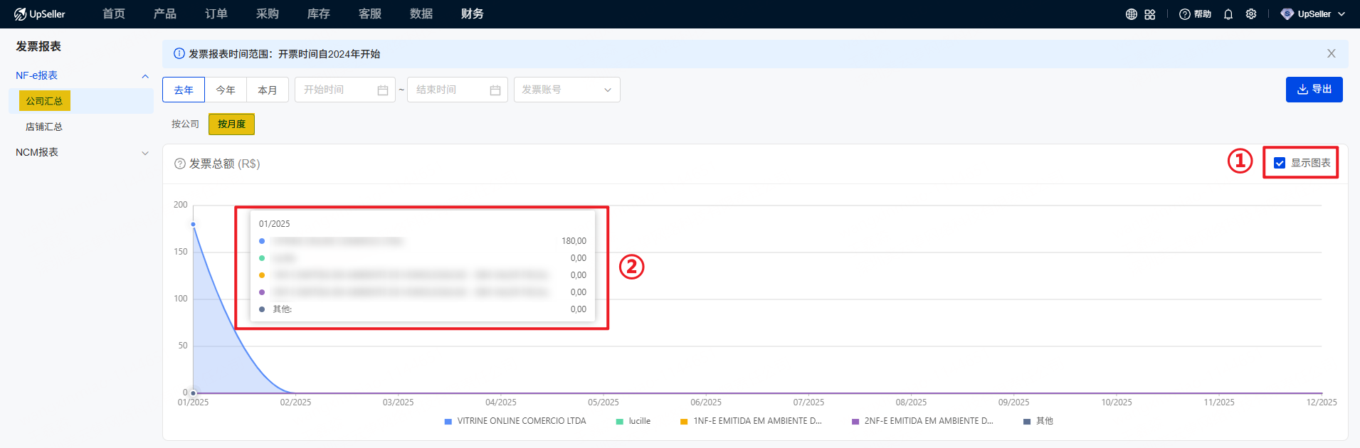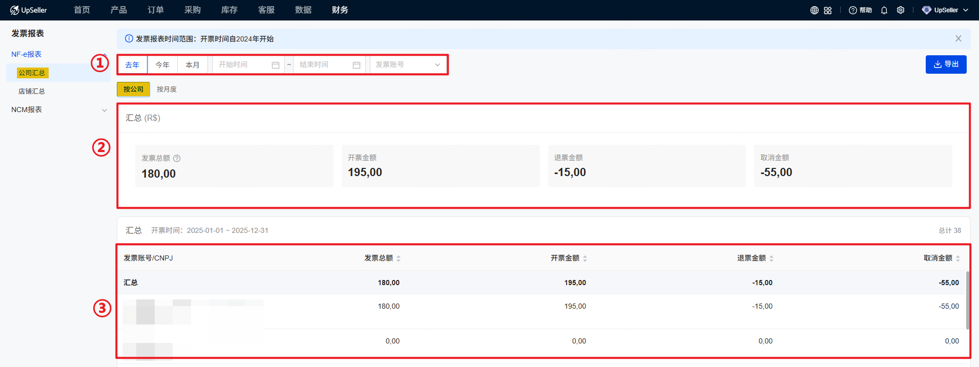 支持查看和统计发票金额数据。对于巴西有报税需求的用户,NF-e报表能够帮助他们直观地了解公司或店铺的开票情况。