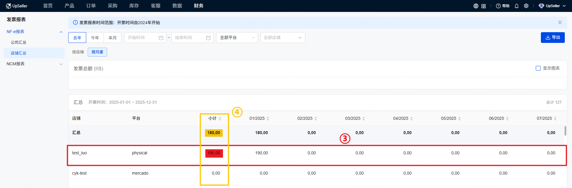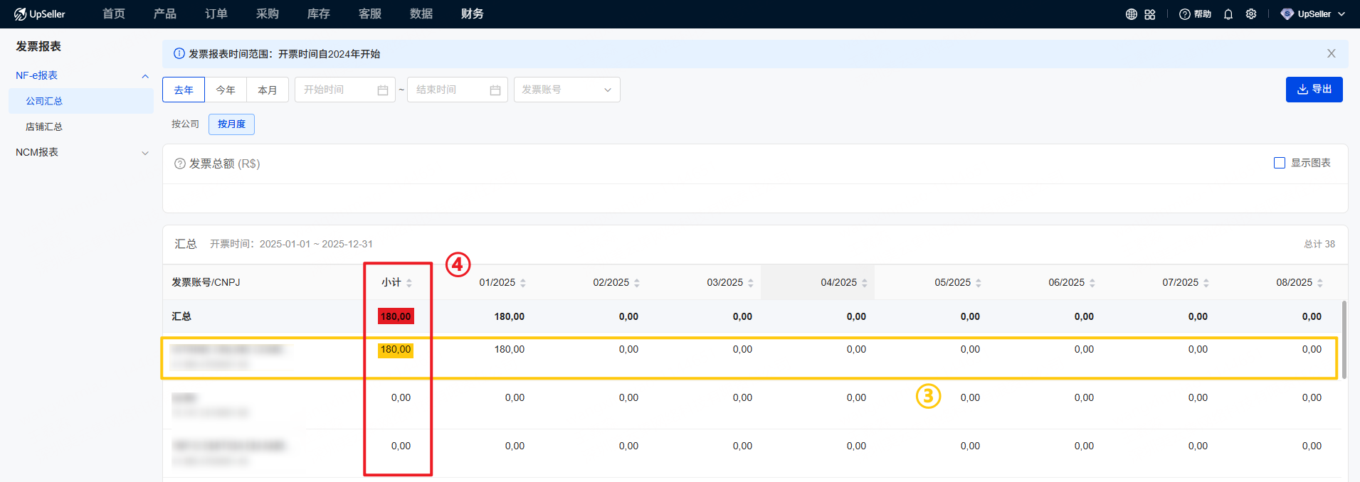 4、店铺汇总 — 按月度(统计展示各公司每个月的发票总额)