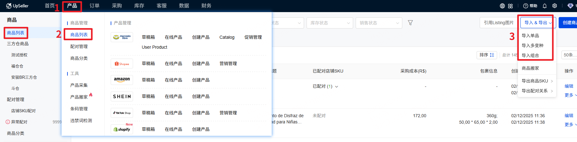 第一步:进入UpSeller商品列表 >> 导入/导出 >> 选择导入单品/多变种/组合 >>下载模版