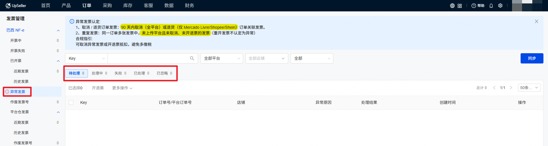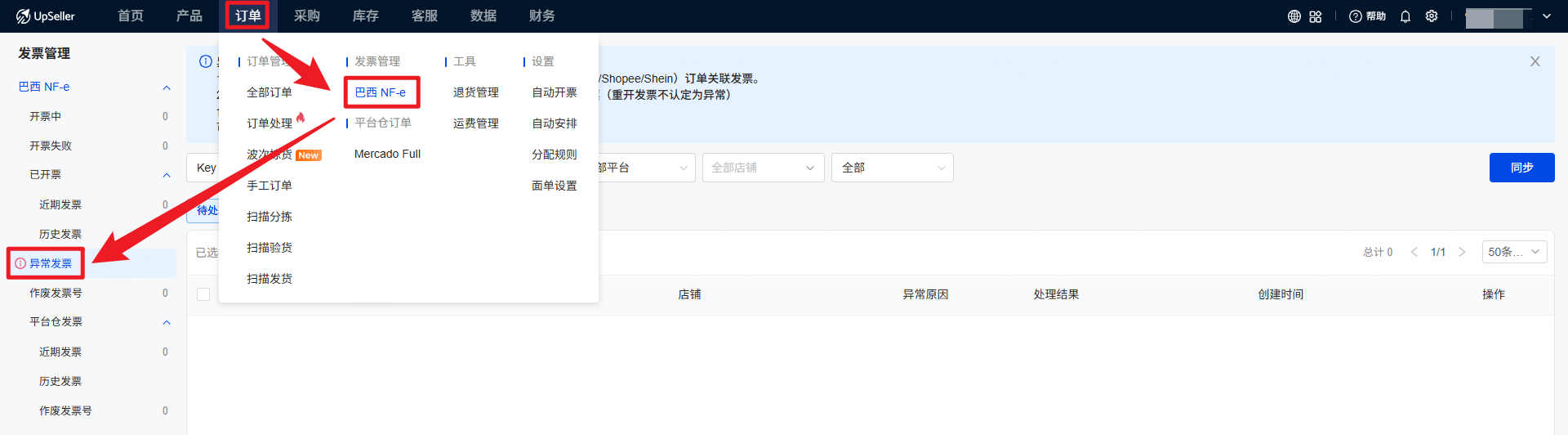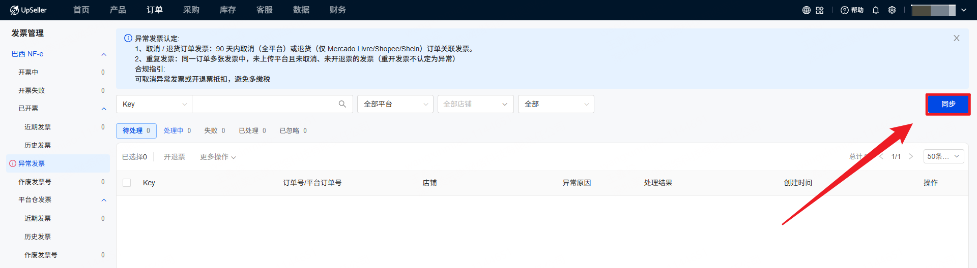 A1:异常发票 > >同步,若同步不到,请联系UpSeller在线客服