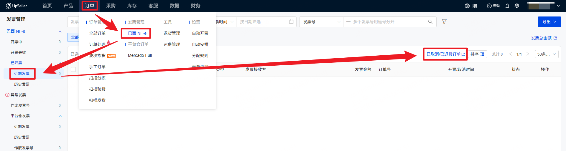 入口二:订单模块 → 发票管理(巴西NF-e) → 已开票 → 近期发票/历史发票 → 已取消/已退货订单