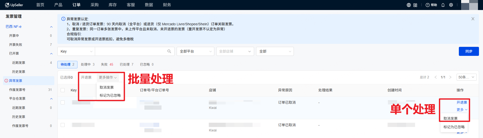 UpSeller 支持单个或批量操作所有店铺的异常发票,提高处理效率,并降低出错率。