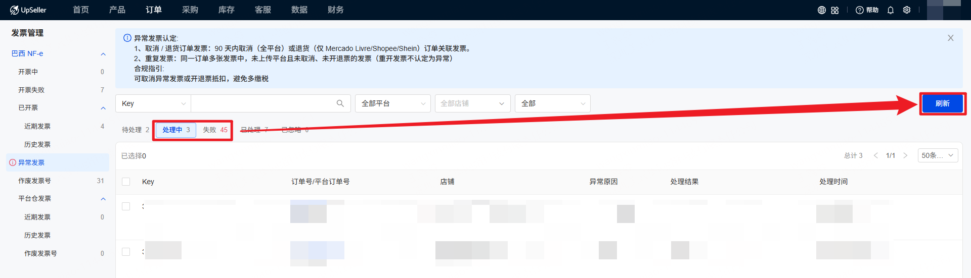 入口一:订单模块 → 发票管理(巴西NF-e) → 异常发票