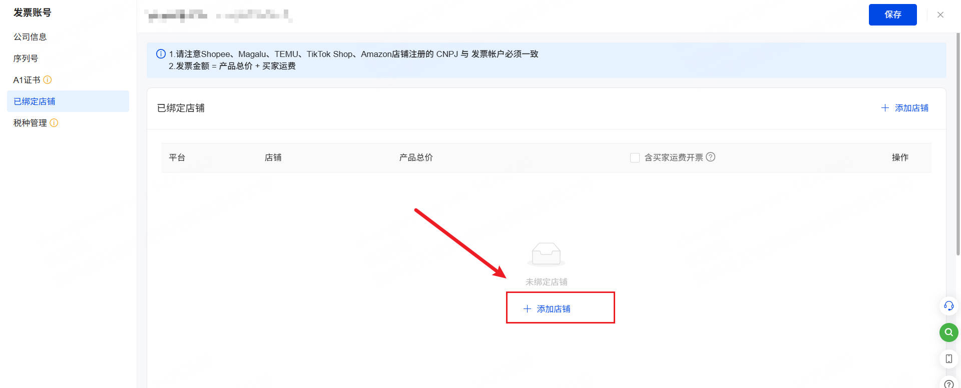详情点击>>第3步:发票账号绑定店铺