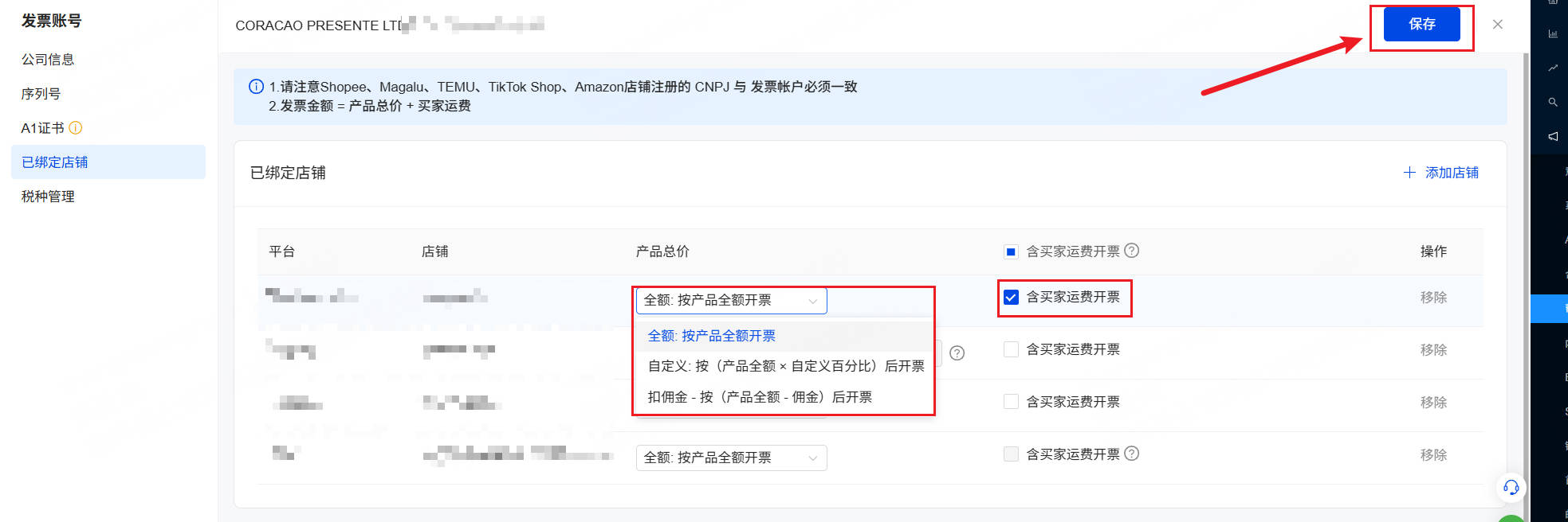 3、设置发票金额的计算方式,可选择勾选含买家支付的运费开票,最后点击【保存】即可。