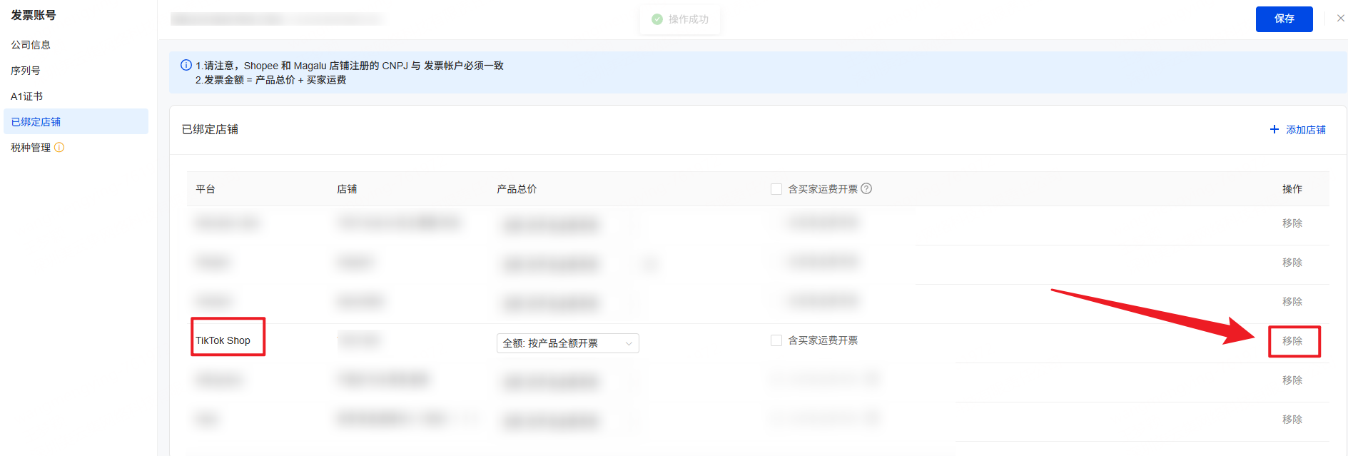 5、店铺绑定正确的CNPJ后,再重新开票并上传至平台