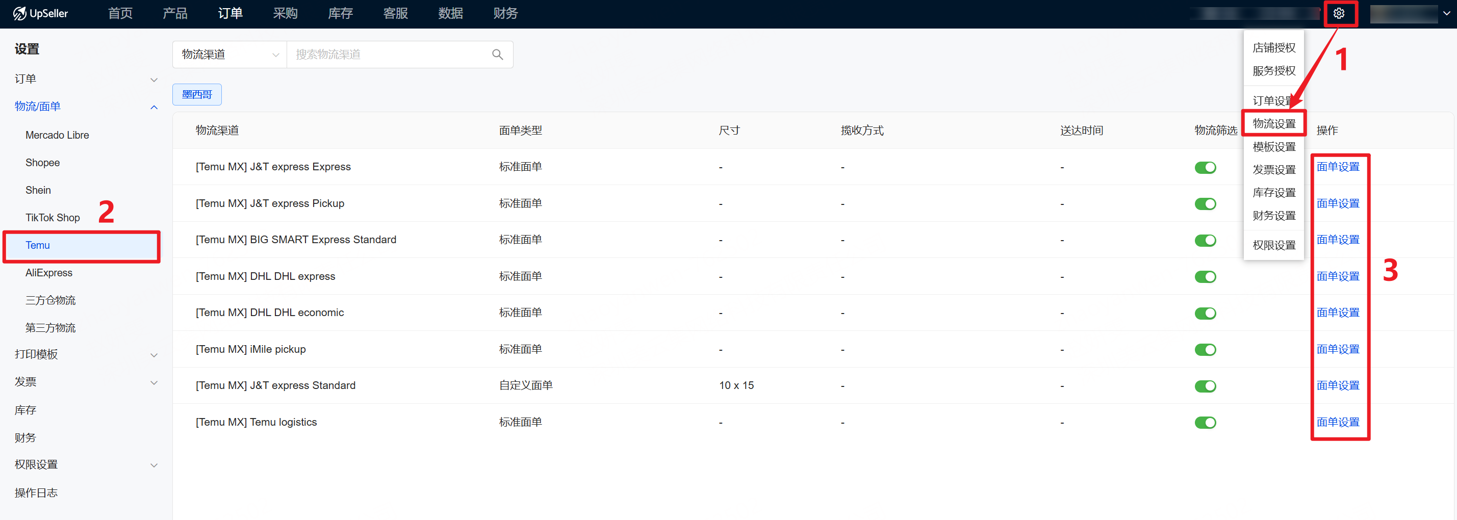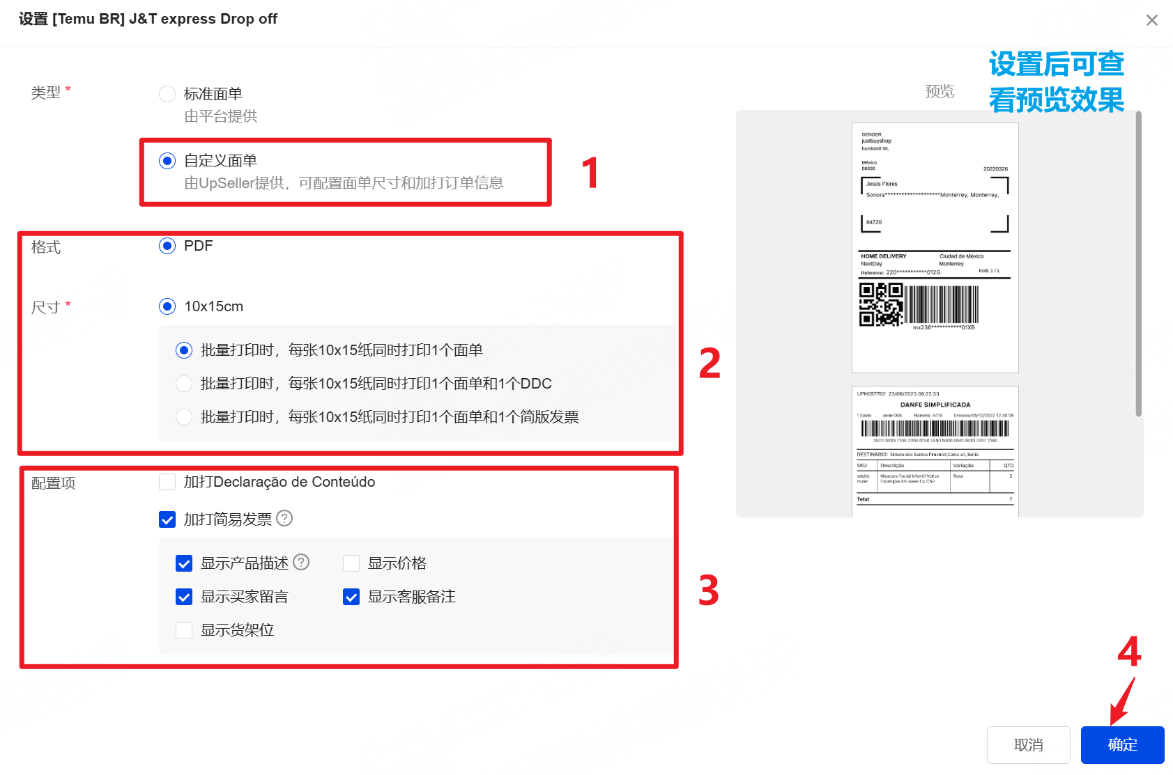 一、功能介绍 UpSeller 自定义面单,在平台标准面单基础上优化升级。可选面单尺寸,加打拣货信息、巴西简易发票及 Declaração de Conteúdo,提升拣货效率 二、操作流程 1、点击“设置-物流设置” >>Temu>>选择对应物流渠道,点击单个物流旁的“物流设置” 2、勾选自定义面单 >> 选择格式、尺寸 >> 根据拣货需要勾选配置项信息;巴西站面单可加打 Declaração de Conteúdo 和简易发票,并做相应的信息展示设置 >> 确定