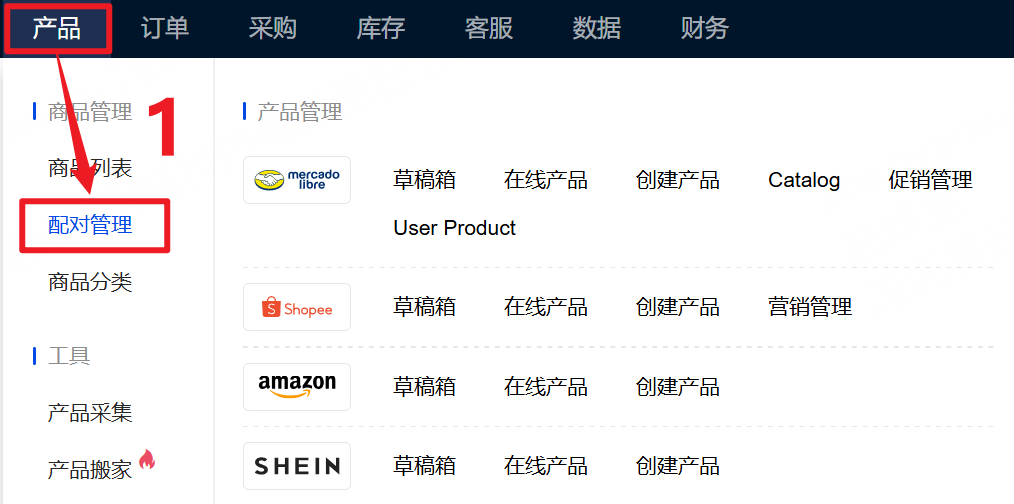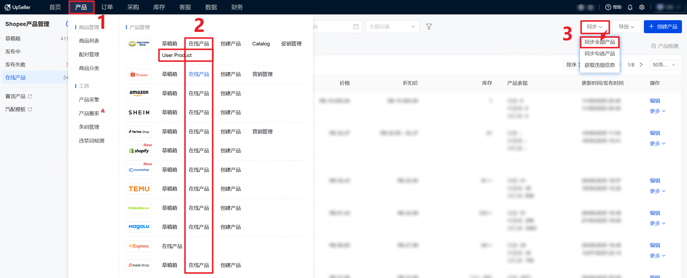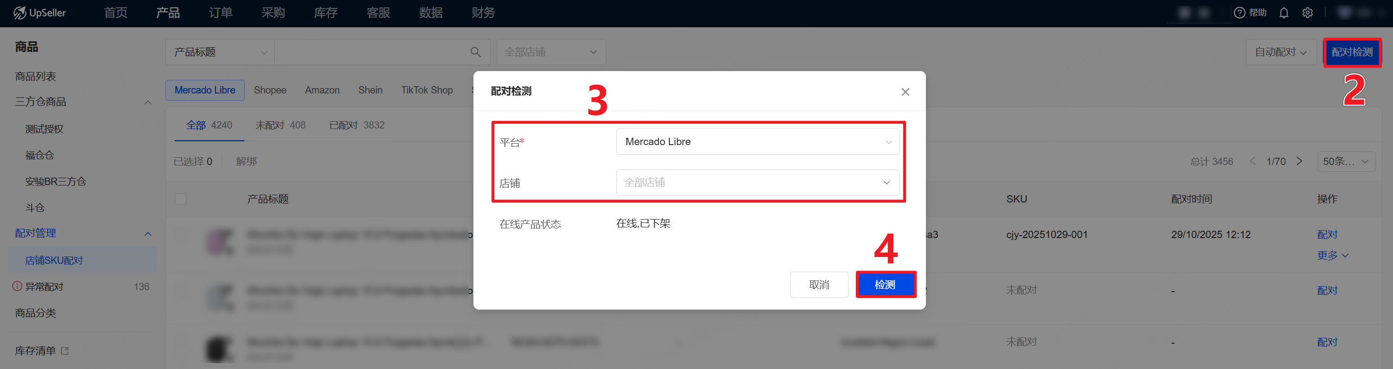 一、原因 店铺SKU还未同步至UpSeller,需要手动同步 二、操作步骤 1、进入【产品】模块>>选择对应平台,点击“在线产品”>>同步 注意:美客多平台新模式店铺的产品,需要进入User Product模块进行同步 2、进入【产品】模块下的配对管理>>点击"配对检测">>选择平台、店铺>>点击"检测"