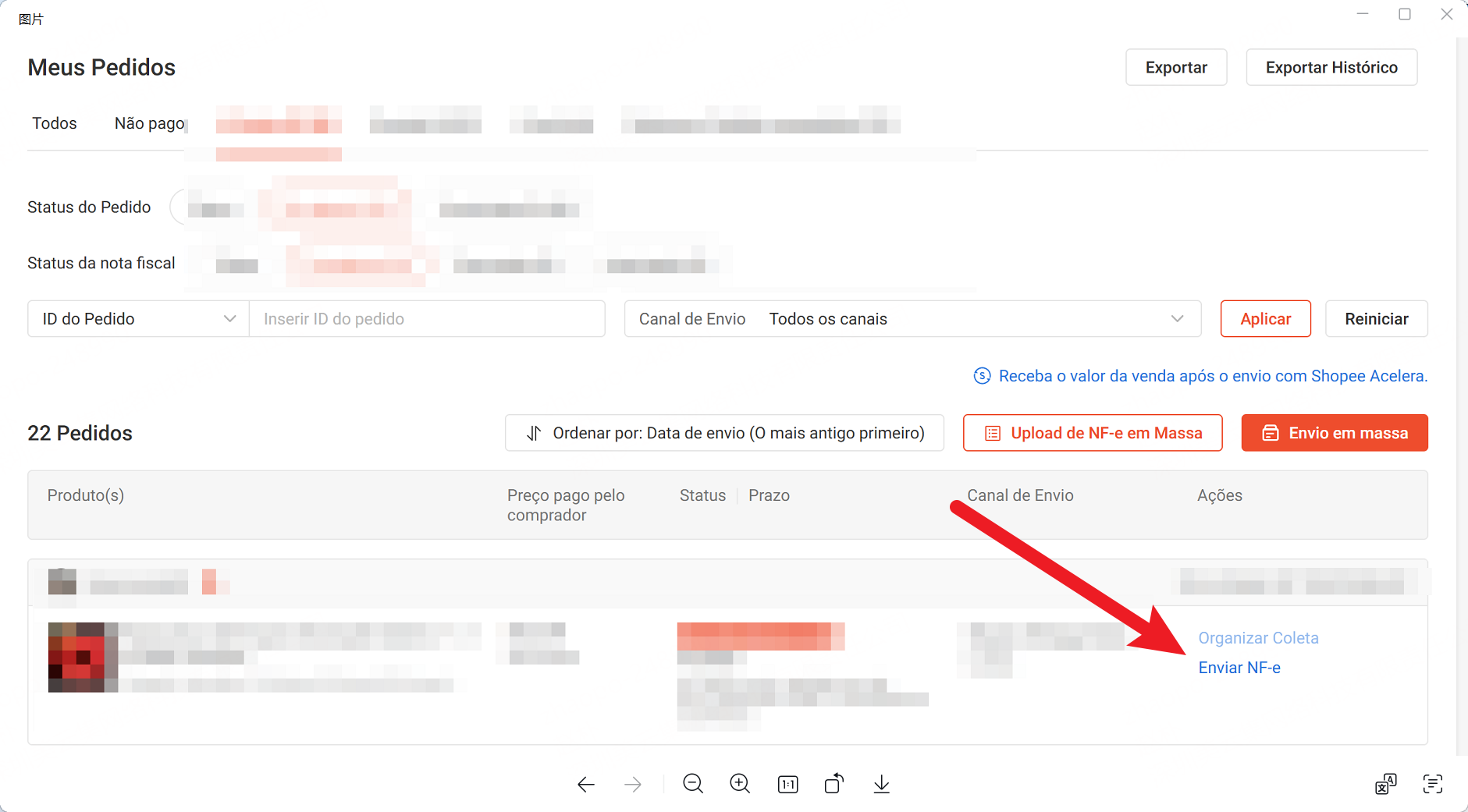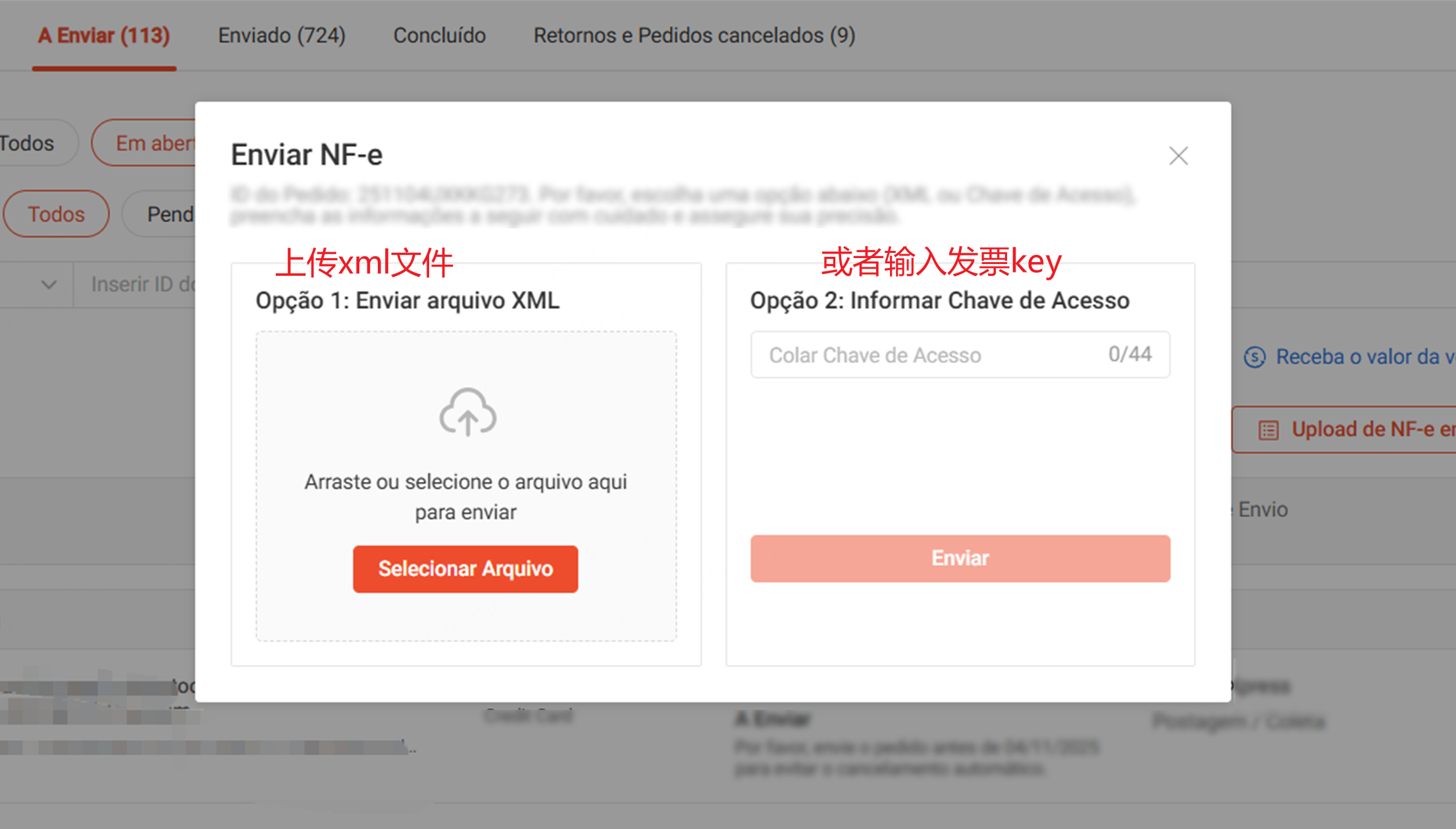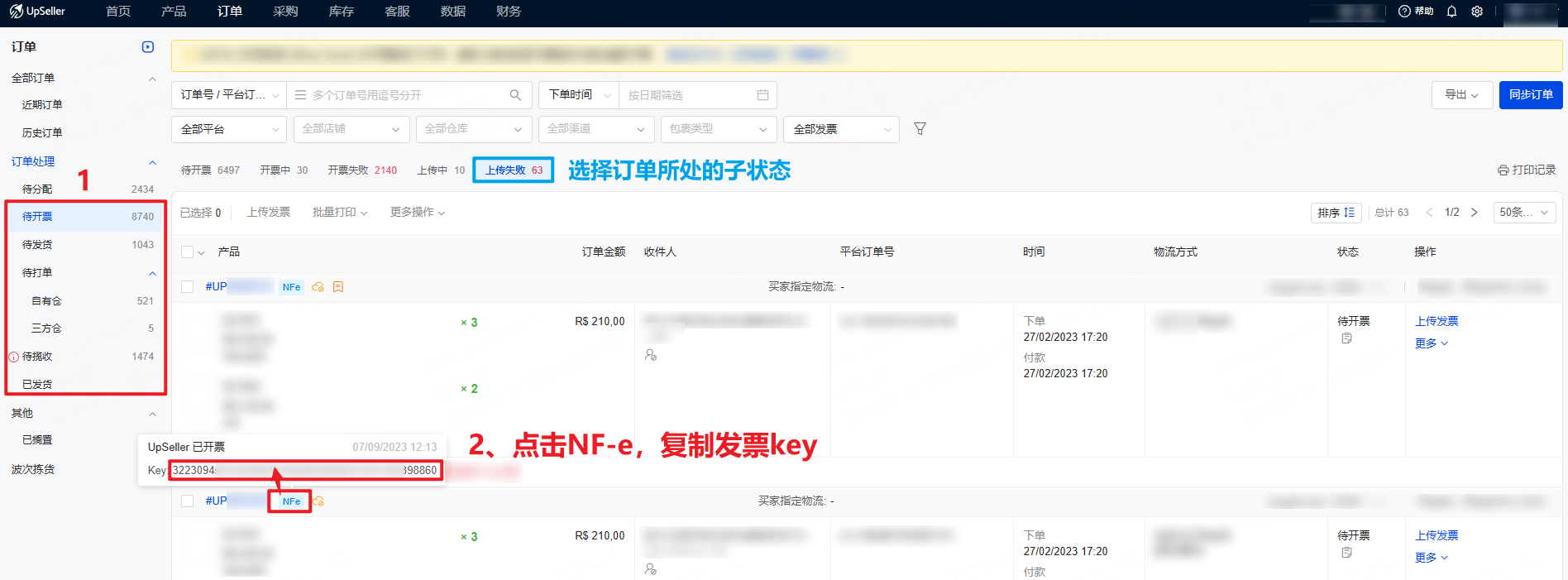一、简介 当服务异常时,可通过 UpSeller 获取发票后上传至 Shopee,避免订单时效延误 二、操作步骤 第一步:从UpSeller获取发票 方式1: 进入订单列表>>选择订单状态>>复制发票Key 方式2:进入巴西 NF-e>>输入UP开头订单号>>单个或批量导出XML 第二步:Shopee 上传发票 进入Shopee卖家中心>>进入订单页面,点击“Enviar NF-e”>>上传XML文件或输入发票key