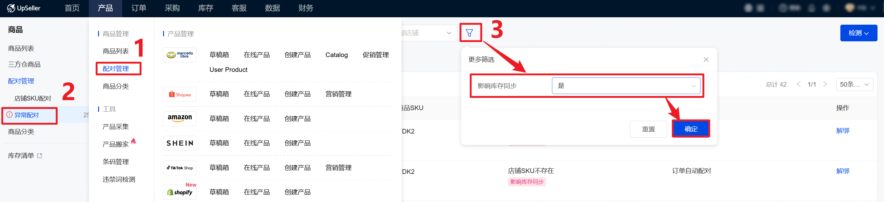 1、进入配对管理>>点击异常配对>>筛选出影响库存同步的异常配对