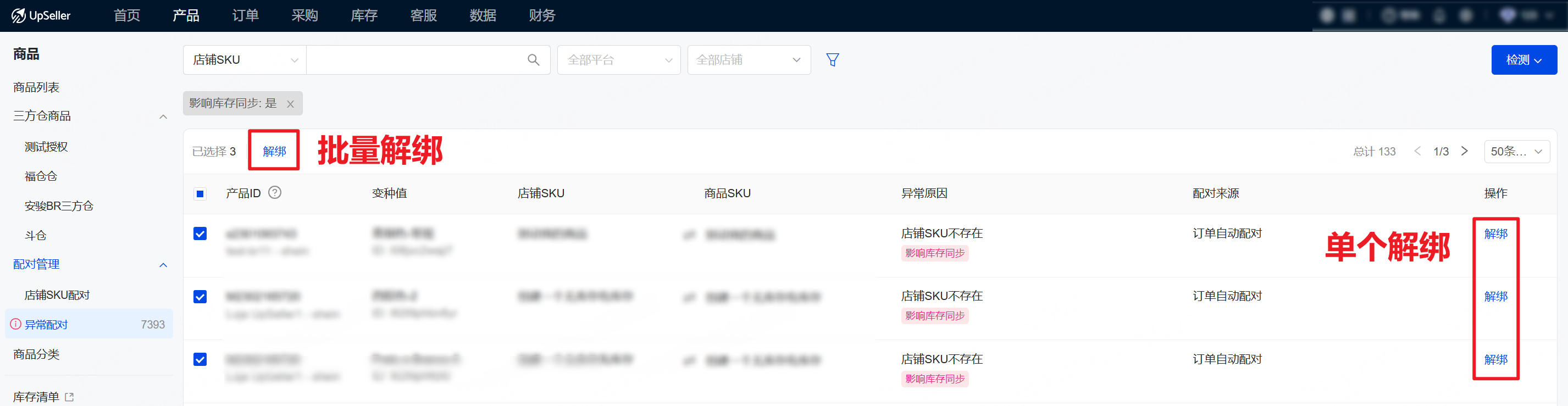 店铺SKU结构变化等多种原因会导致异常配对,部分异常配对会导致库存同步失败,需及时重新配对二、异常原因