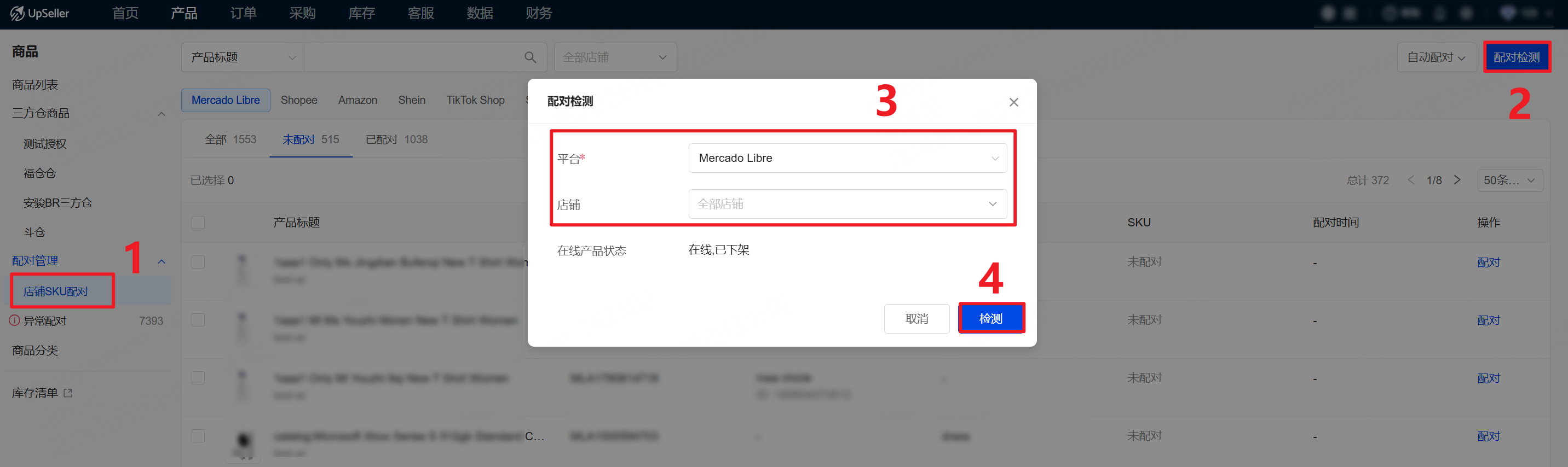 3、进入店铺SKU配对>>配对检测>>选择平台、店铺>>点击"检测"