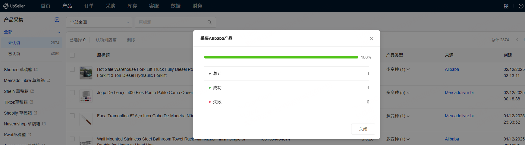 UpSeller能够快速的采集Alibaba平台上一件代发的产品 ,并编辑修改发布到店铺。 一、注意事项 Alibaba平台支持本地发货/本土仓库的产品才有一件代发的操作入口。 三、操作流程 第一步:在Alibaba平台一件代发的产品详情页>>点击【开始一件代发】>>选择【UpSeller】>>点击铺货>>页面会跳转到UpSeller产品采集的页面 采集成功如下图: 第二步:勾选产品>>批量认领产品到店铺>>选择店铺>>确定 第三步:产品成功认领后即可前往平台草稿箱编辑产品信息并发布