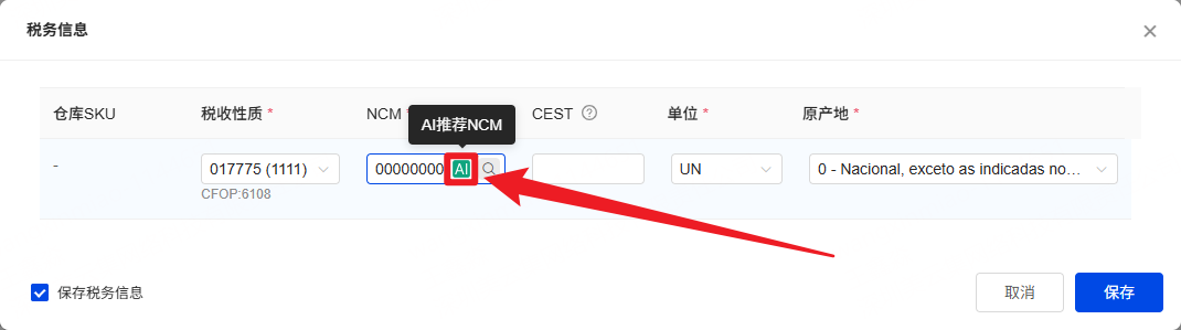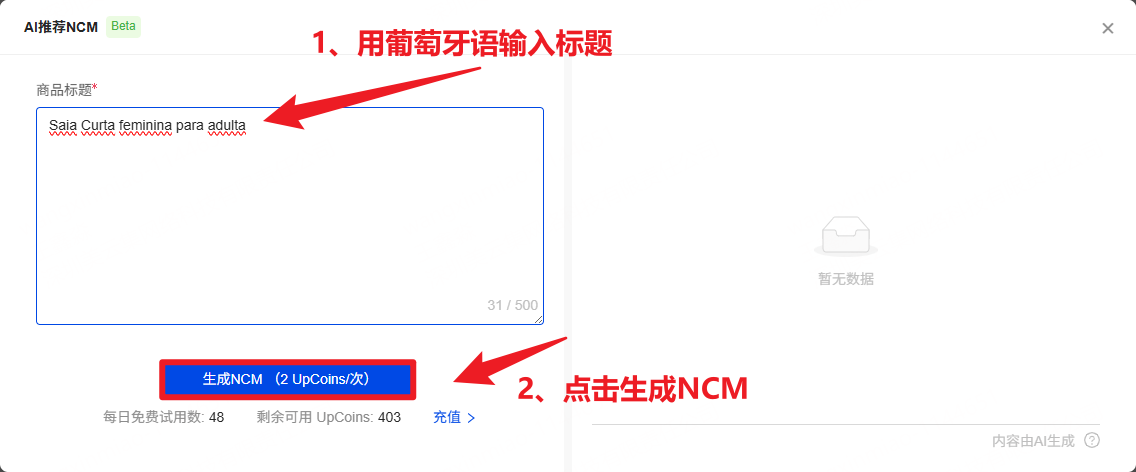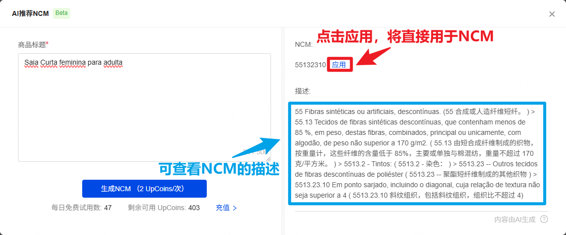 一、功能介绍 使用AI推荐NCM功能,填写商品标题,为您智能推荐巴西海关编码,大幅度提升订单处理效率 二、注意事项 1、不同套餐版本的每日免费额度不同。若当日免费额度用尽,每次使用需花费 2 UpCoins 2、生成后的NCM无论是否应用,都会扣减额度