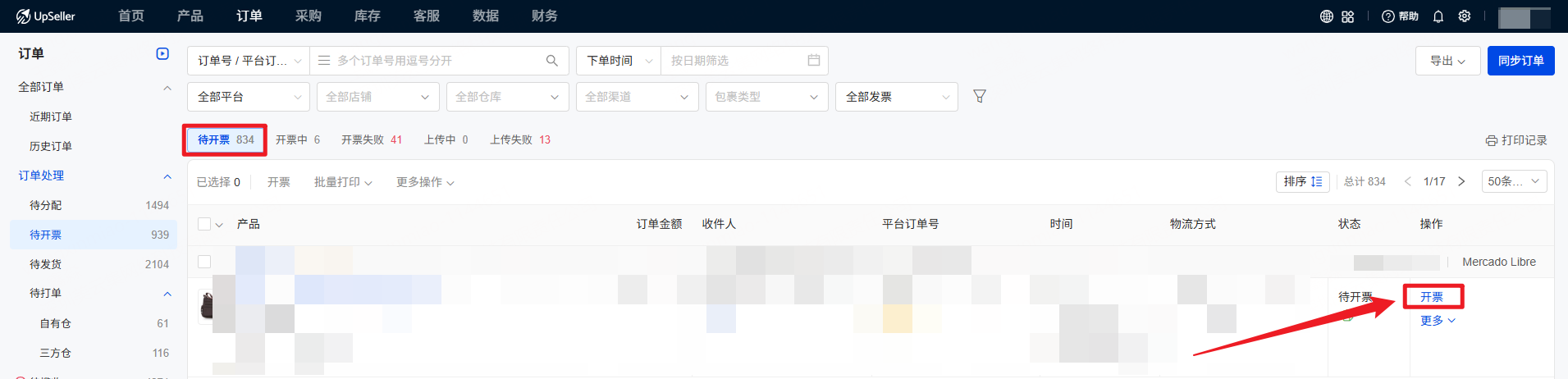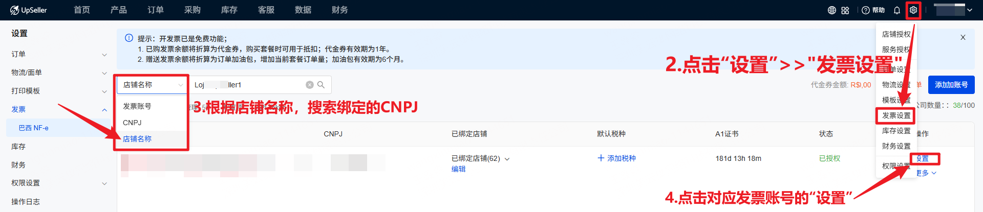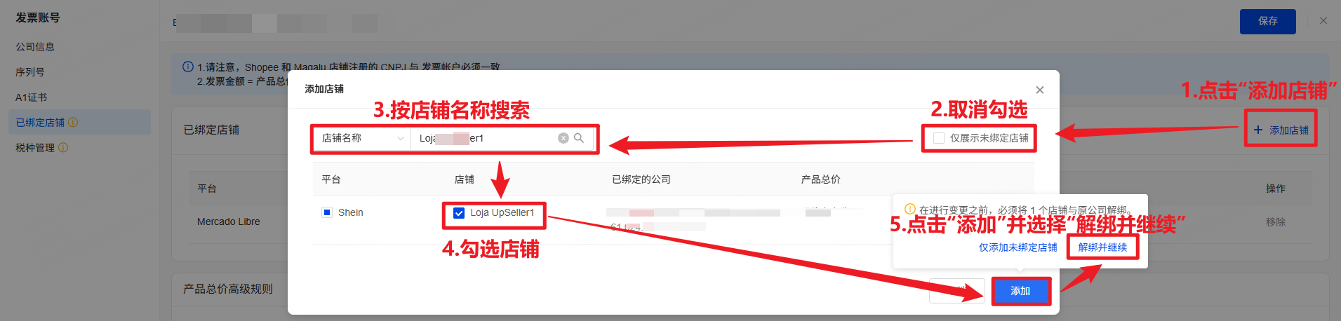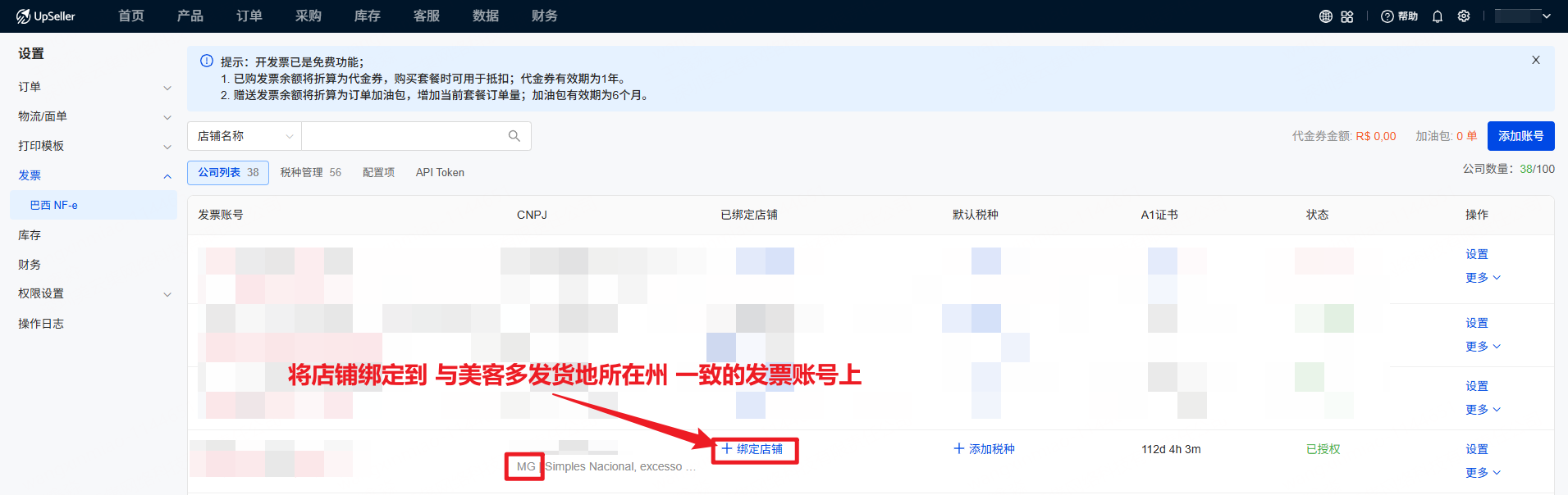 ①在UpSeller将店铺绑定到 与美客多发货地所在州相同的发票账号(MG)上