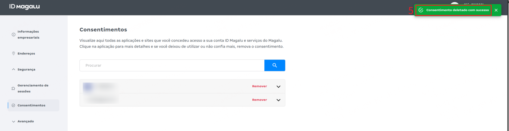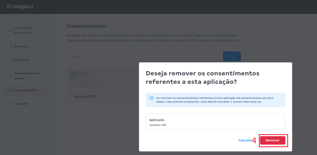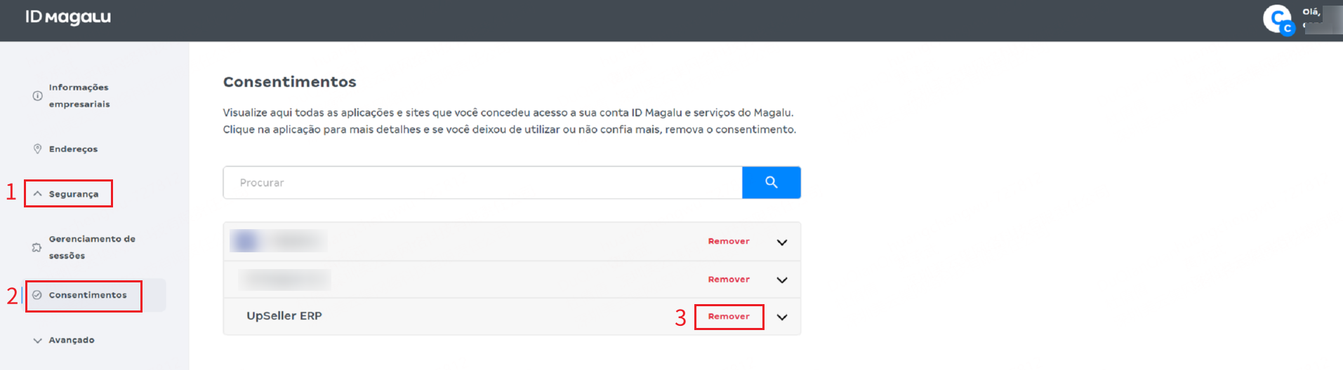 登录https://id.magalu.com/consents >> 点击Segurança >> Consentimentos >> 选择UpSeller ERP >> 点击 Remover即可