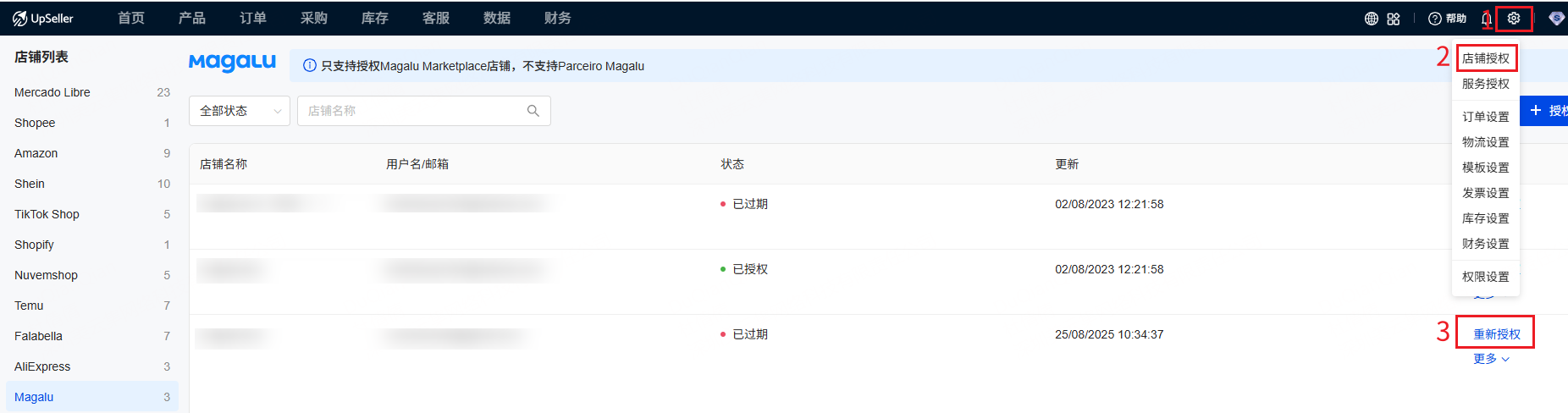 注意:Magalu店铺后台解除授权之后需要等待半个小时后,才可以在UpSeller页面操作重新授权店铺