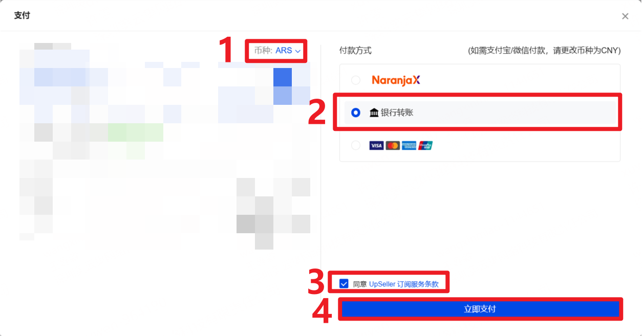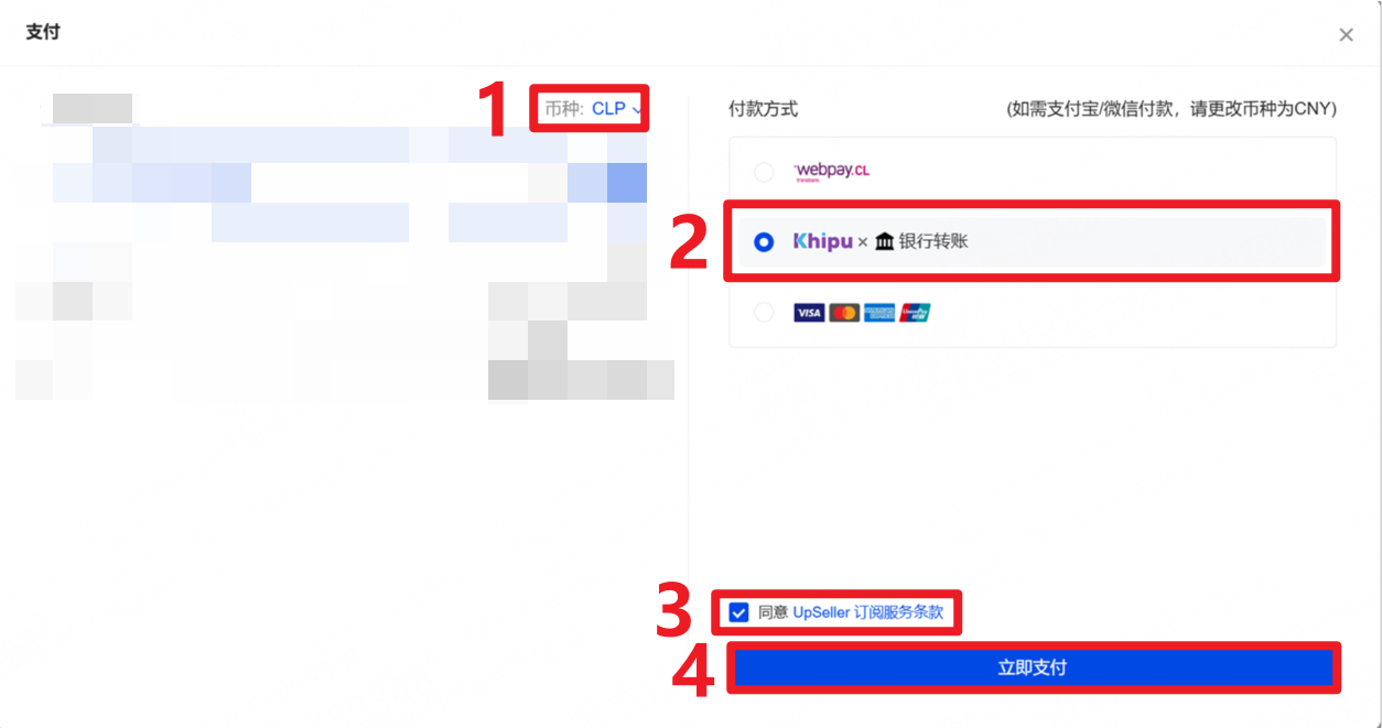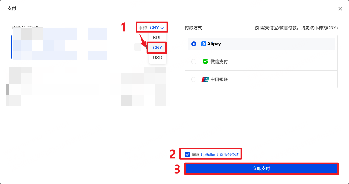 切换币种为人民币(CNY),选择付款方式,勾选服务条款后,点击“立即支付”