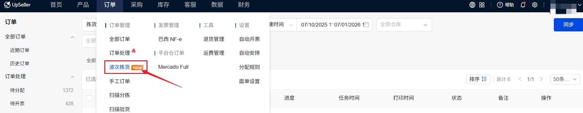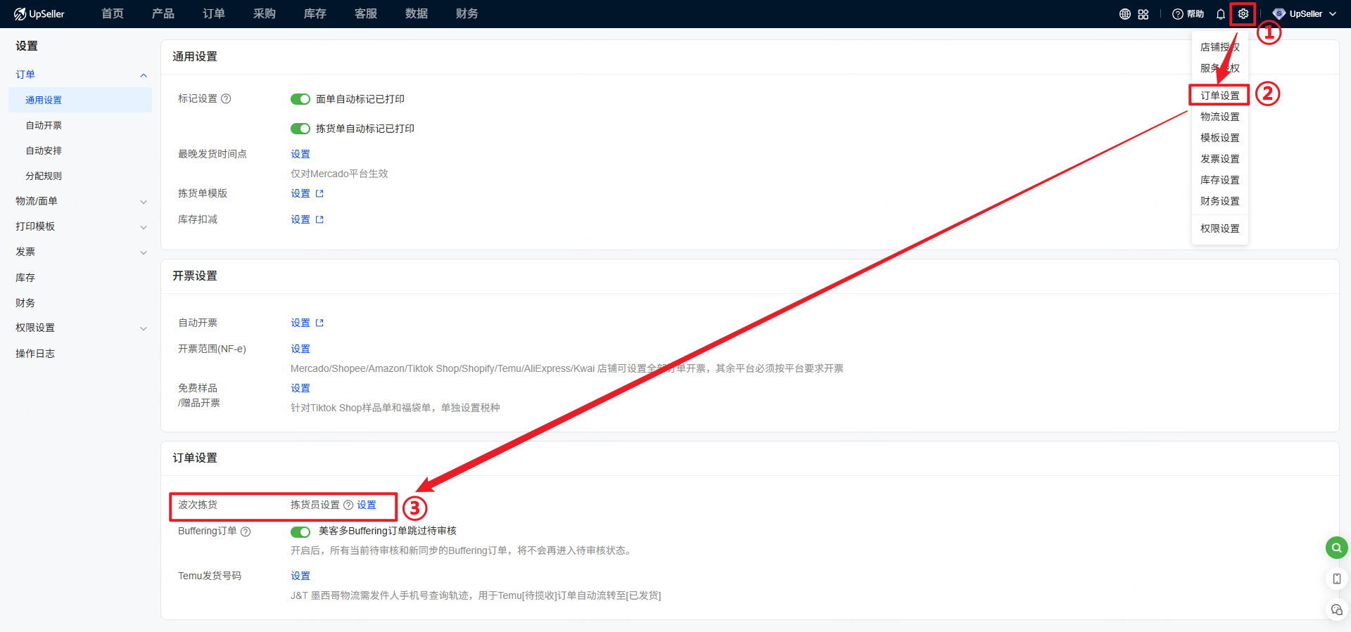 入口一:点击右上角【设置】>>【订单设置】>> 找到“波次拣货”,点击“设置”