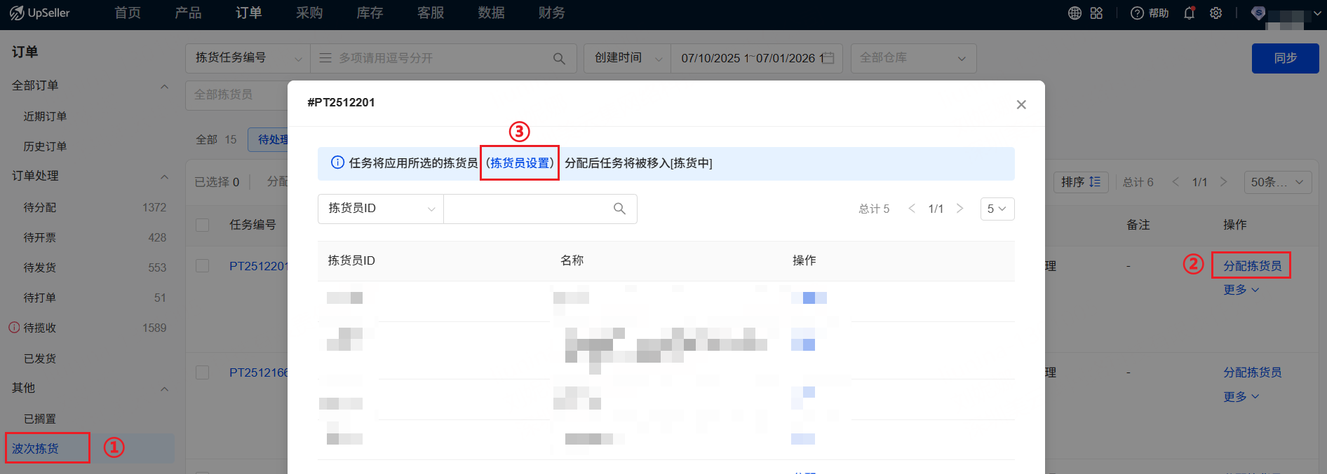 入口二:进入【订单】模块>>波次拣货>>分配拣货员>>拣货员设置