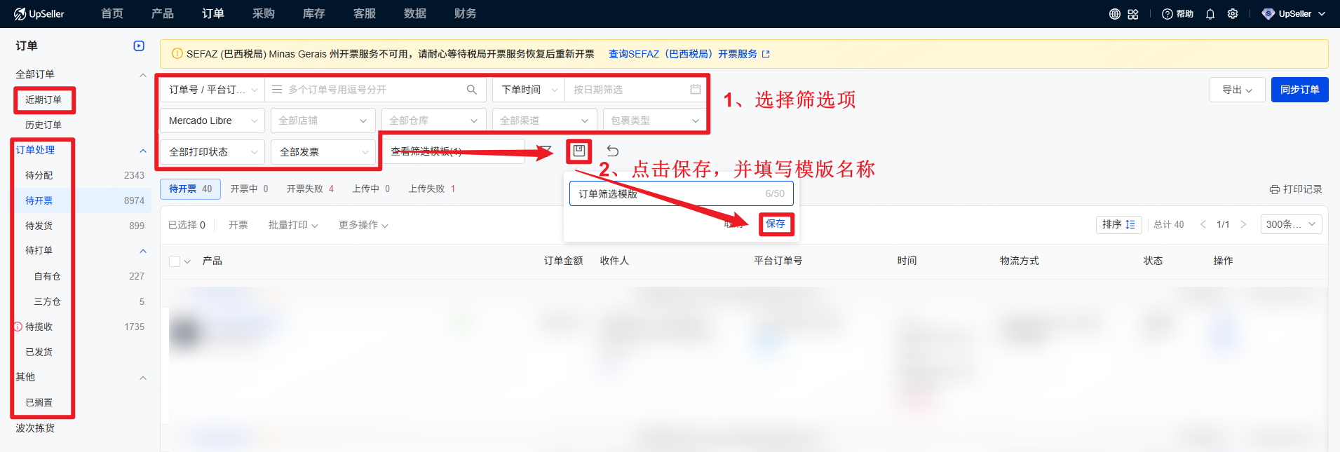 在“近期订单”、“订单处理”和“已搁置”页面,选择需要的筛选项后,点击“保存”并填写“筛选模板名称”以创建新模板。