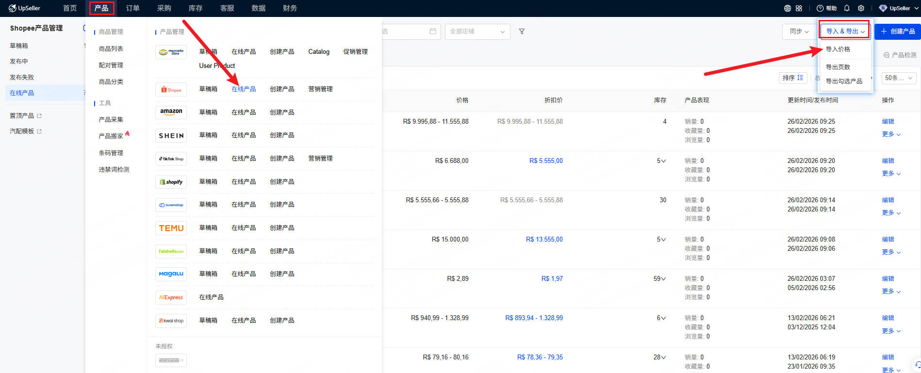 点击【产品】模块>>Shopee>>在线产品>>点击“导入&导出”>>选择“导入价格”