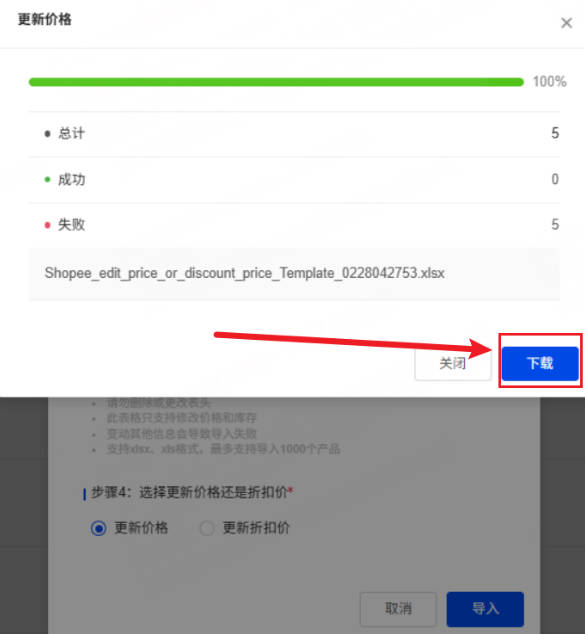 当选择“更新价格”时,仅更改产品价格;当选择“更新折扣价”时,仅更改产品的折扣价,同时,Shopee营销管理中参加活动的折扣价也会相应修改。
