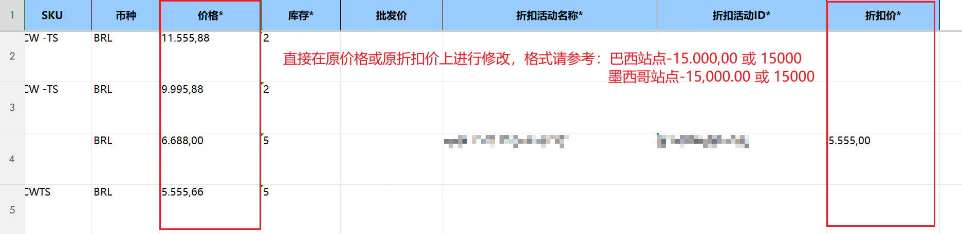 ②价格或折扣价只能精确到小数点后2位。例如一万五千,巴西站点:15.000,00或15000;墨西哥站点:15,000.00或15000
