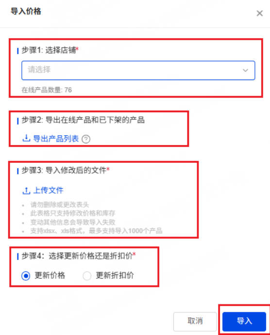 • 支持xlsx、xls格式,最多支持导入1000个产品