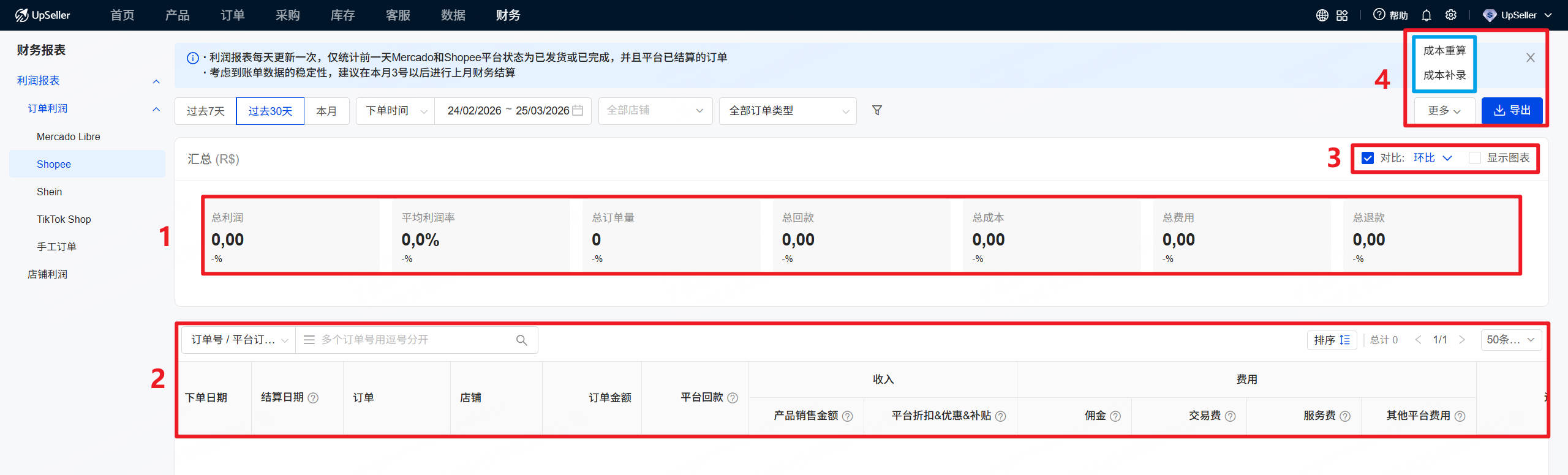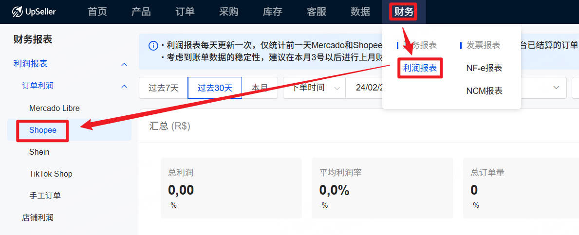 (注意:需确保商品SKU采购成本或平均成本已填写。未填写则补充,操作详情>>https://www.upseller.com/zh-CN/doc-article/2119-如何填写订单利润的商品成本)