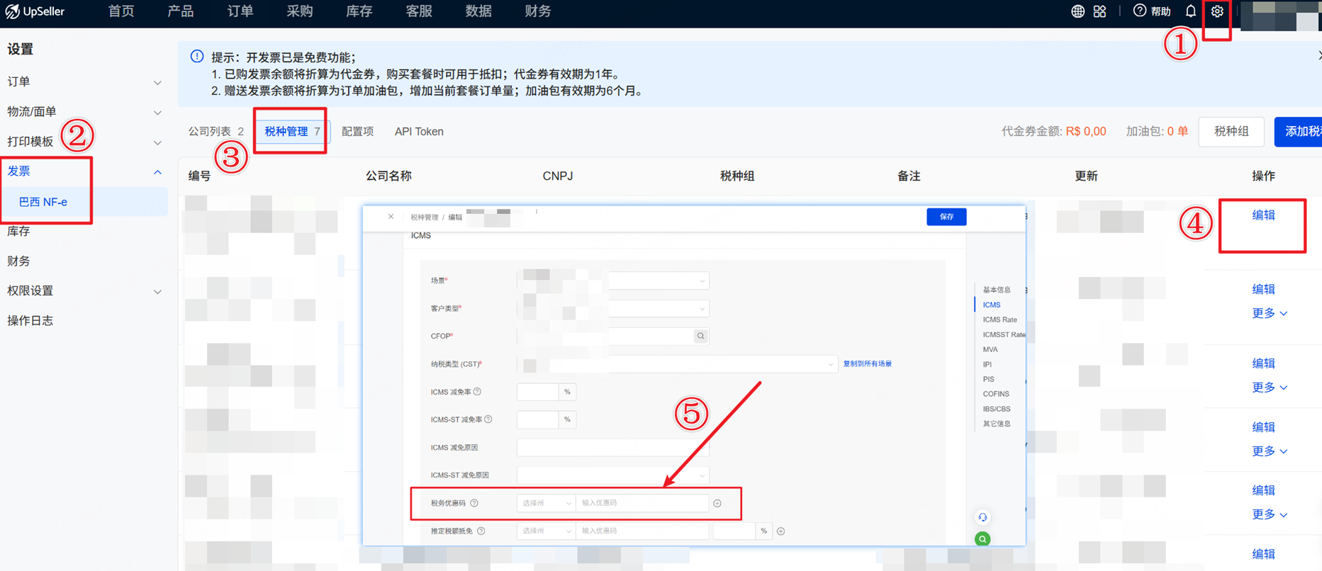UpSeller主账号右上角>>点击设置>>发票设置>>税种管理(选择开票时使用的税种)>>编辑>>根据纳税类型(CST)选择发货州和该发货州开票商品的优惠代码>>保存即可