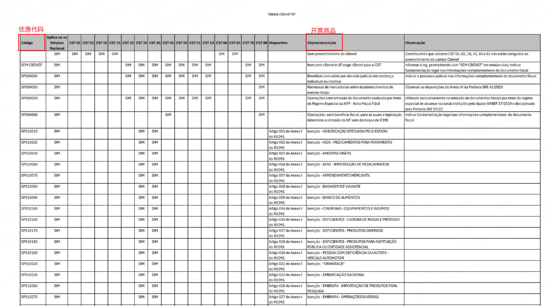 每个州的税局官网会有专门的优惠代码与优惠商品关联的税收优惠表(Tabela de Benefícios Fiscais)