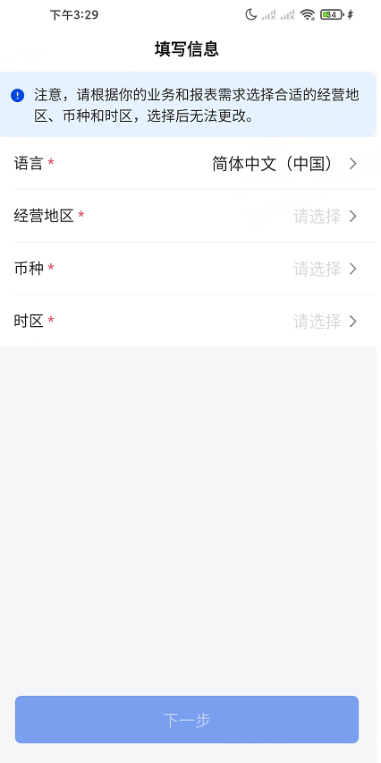 第二步:选择语言后,经营地区,选择了经营地区之后系统会自动填充币种,时区(经营地区、货币和时区只能选择一次,系统语言可自由切换)