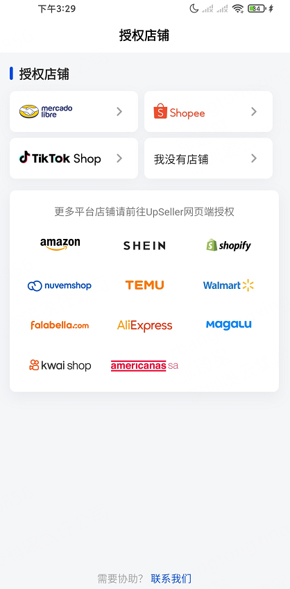 提示:目前APP端仅支持授权 Mercado、Shopee 和 TikTok Shop,如需授权其他平台,可以登录web端进行授权 >> www.upseller.com