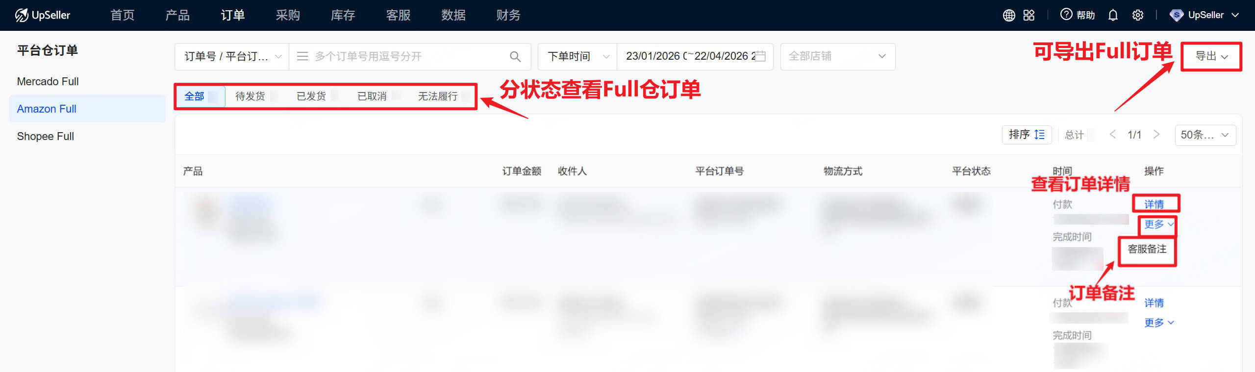 支持分状态查看 Amazon Full 仓订单,支持导出订单数据。