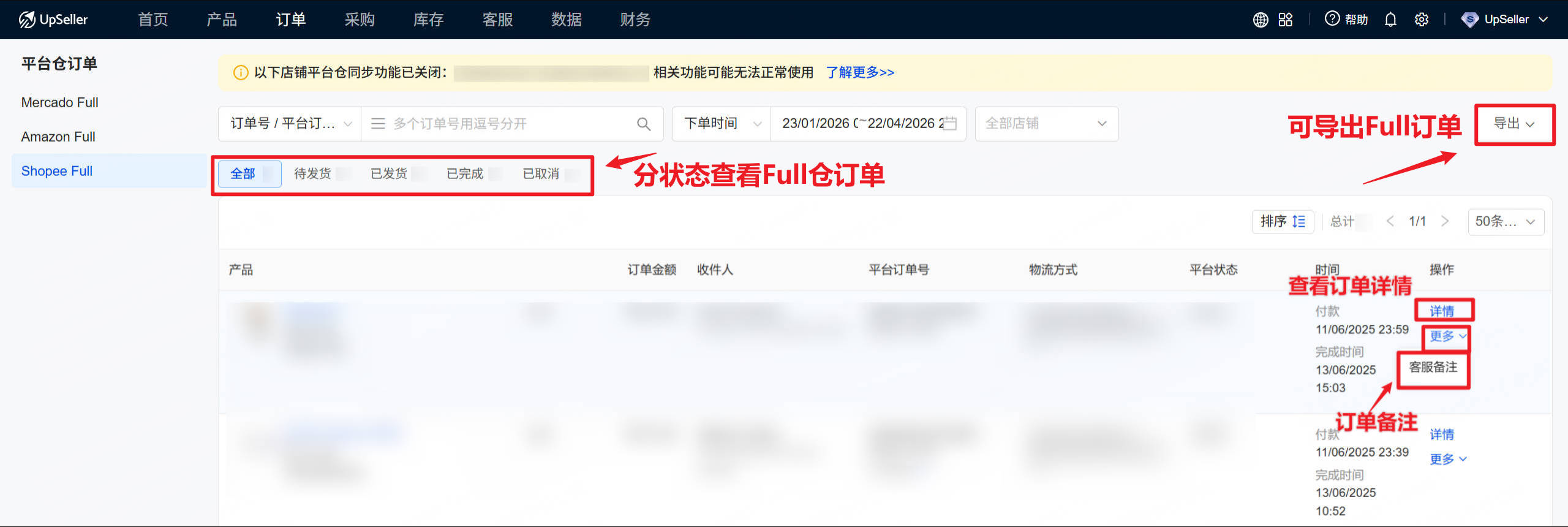 支持分状态查看Shopee Full仓订单,支持导出订单数据。