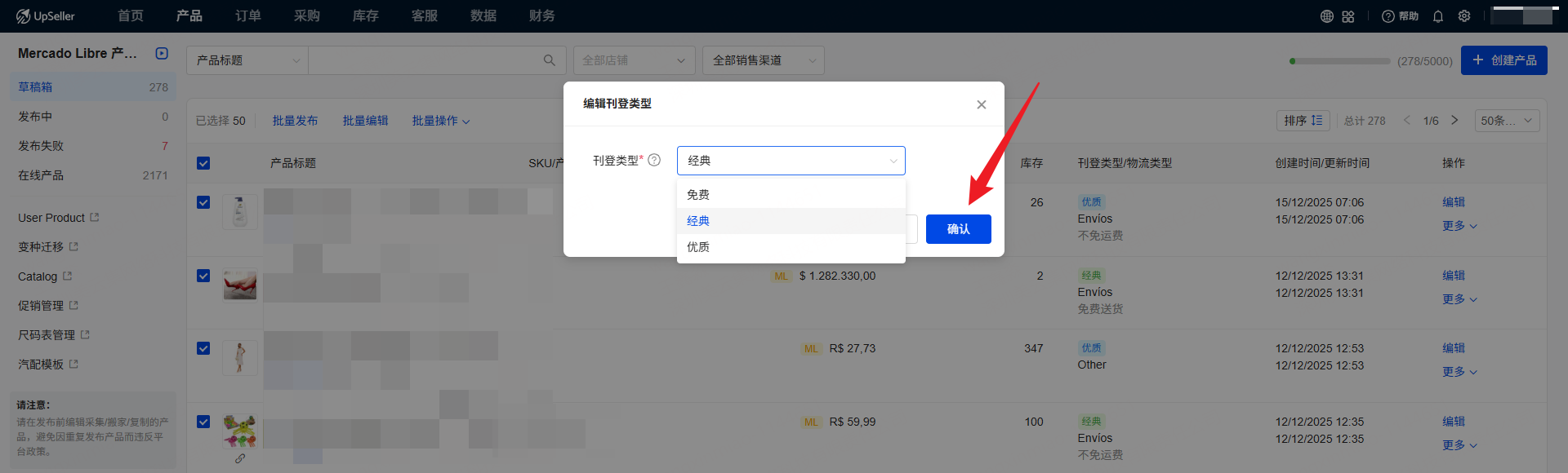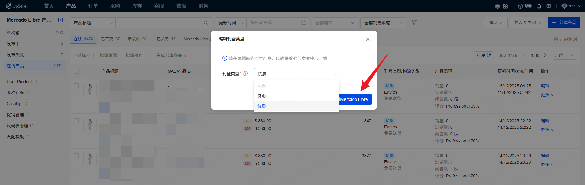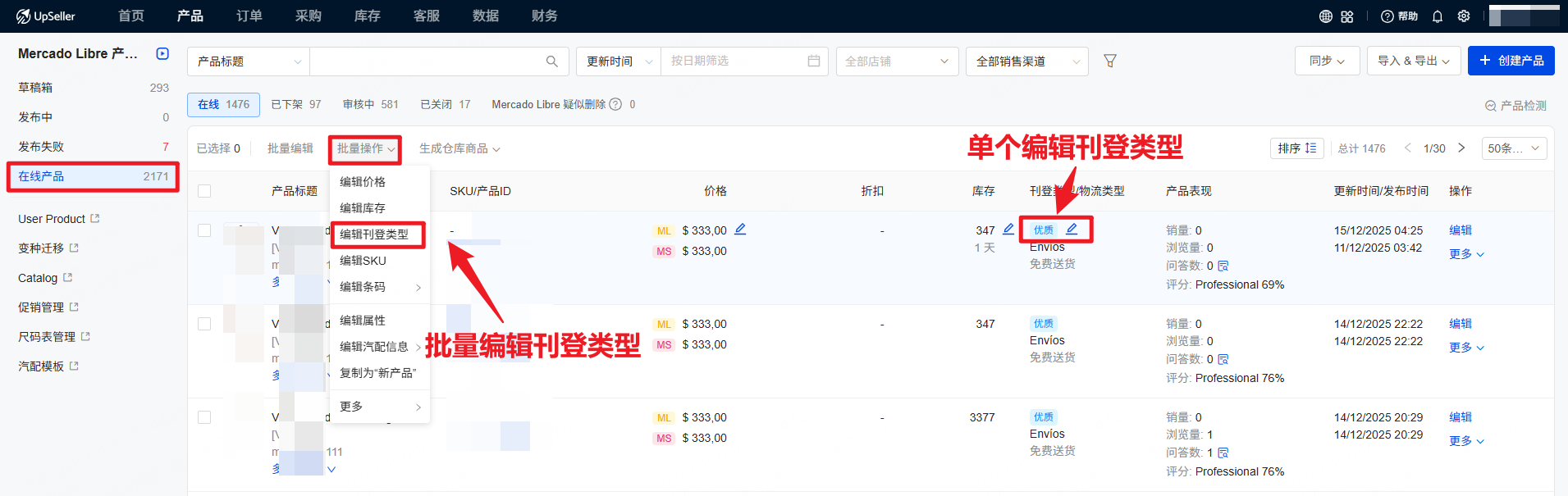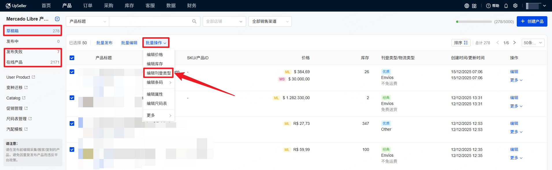 一、注意事项 1、如果库存数量大于 1,则只能以经典或优质类型发布产品 2、在线列表进行单个或批量编辑刊登类型,建议请先同步产品,以确保数据与卖家中心一致 3、在线产品列表相同的刊登类型不能进行重复更新操作 二、操作步骤 1、点击产品 >> 进入Mercado“草稿箱”/ “发布失败”界面 >> 勾选产品 >> 批量操作 >> 编辑刊登类型 2、点击产品 >> 进入Mercado“在线产品”界面,支持单个或批量编辑刊登类型