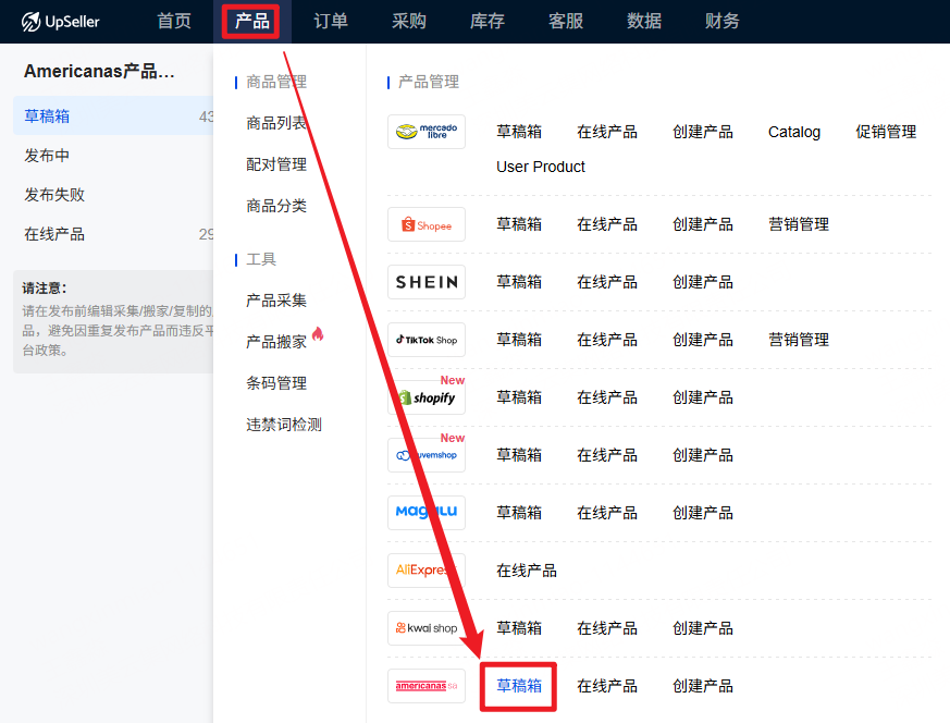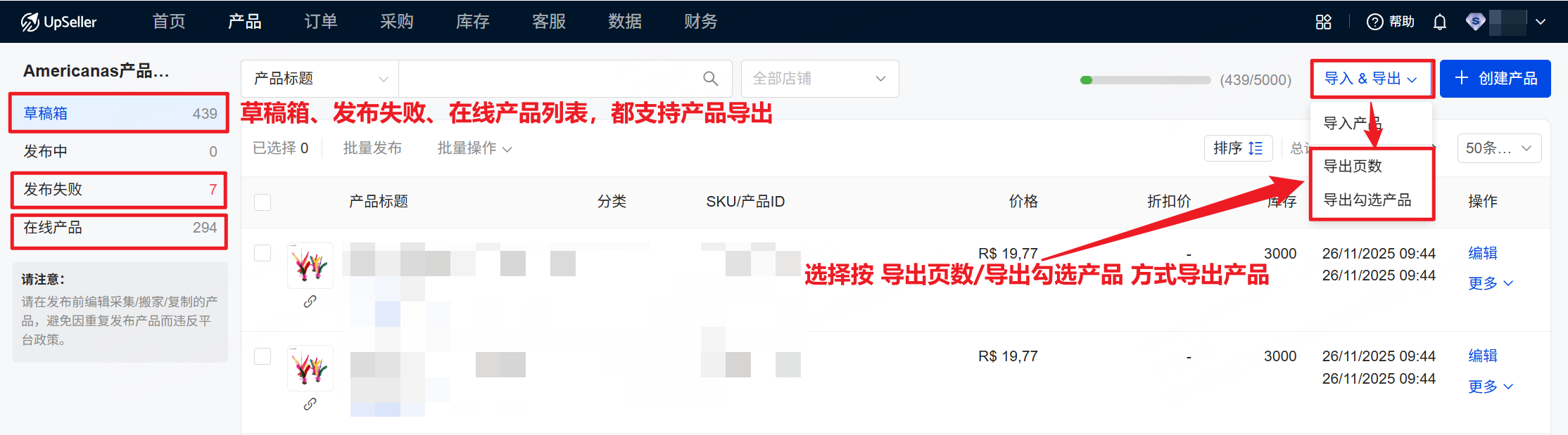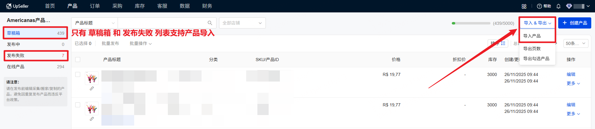 • Americanas(B2W)草稿箱和发布失败状态支持导入/导出产品,在线产品列表仅支持导出产品