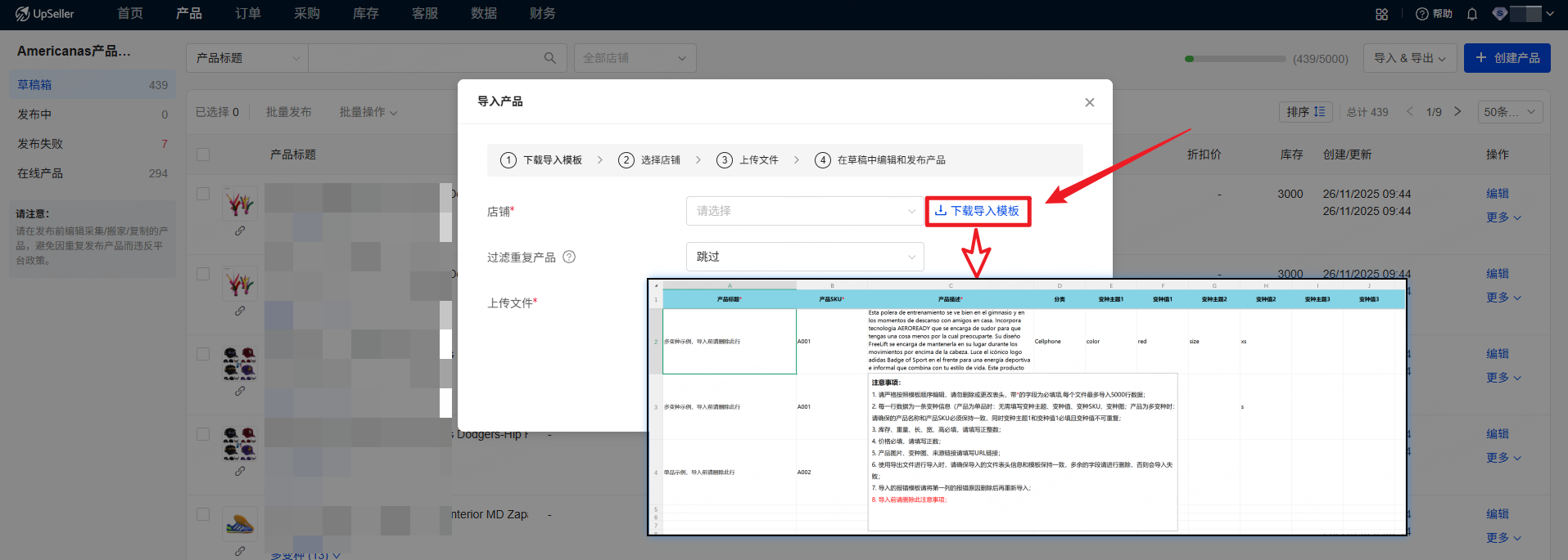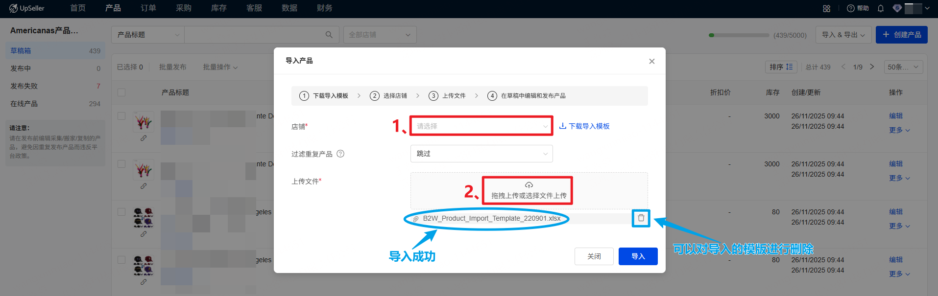 1、导入:首先下载导入产品模板,完善表格内的信息,然后选择店铺和导入文件,成功导入到平台草稿箱内进行编辑和发布操作
