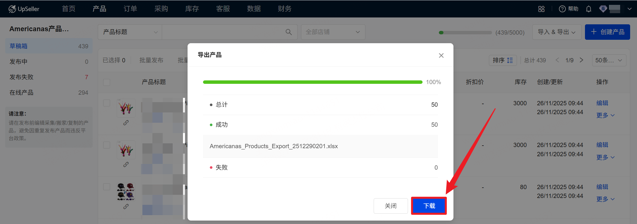• 按页导出一次只能导出5000个产品(如果导出的产品超过5000个,则导出失败,需要修改导出的页数并重新进行导出,确保产品数量≤5000个才可以成功导出)